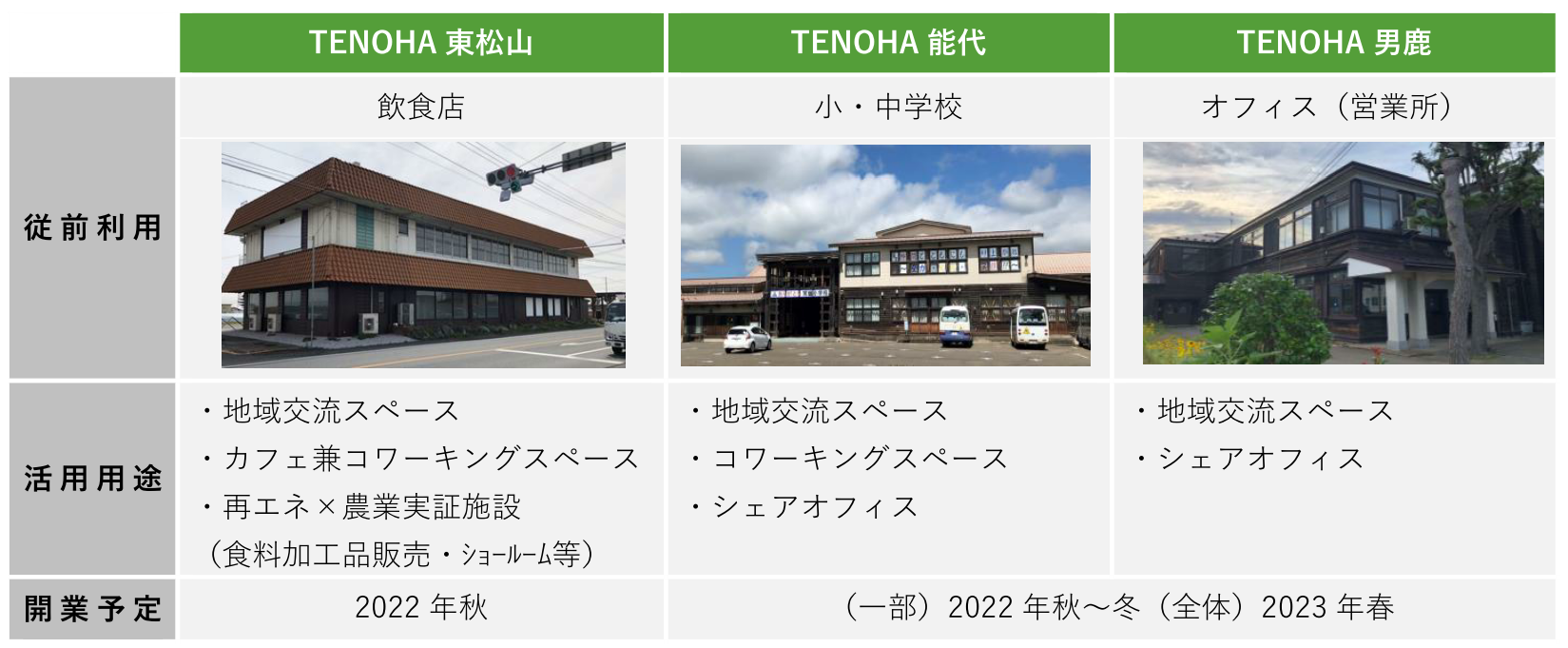 現在、当社が開発を推進する「TENOHA東松山」「TENOHA能代」「TENOHA男鹿」の3施設では、地域のパートナーの皆さまと連携を図り、地域の資産・資源である既存施設を利活用(リノベーション)し、「人・モノ・サービスが育つ」場所を生み出すことを目指します。また、各施設において運営連携・相互利用を図りながら地域活性化につなげる施設づくりに取り組んでまいります。