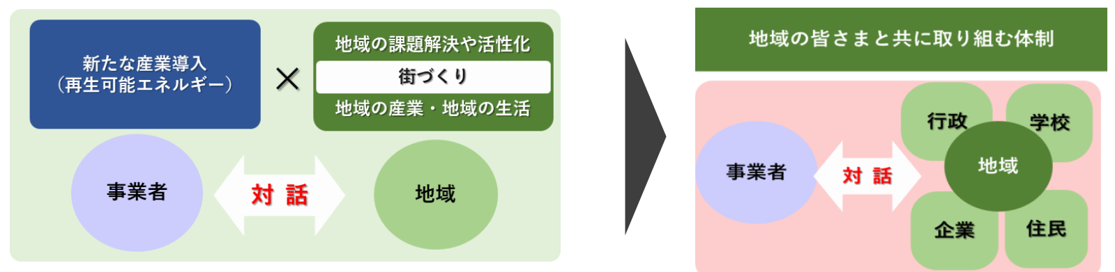 当社は、「新たな産業導入が、地域の暮らしを良くしていくこと」を体感していただくことで、「円滑な産業導入」「地域の課題解決や活性化」の両面につながっていくという考えのもとに、各地で地域の皆様と対話をしながら、地域共生プロジェクトに取り組んでいきます。