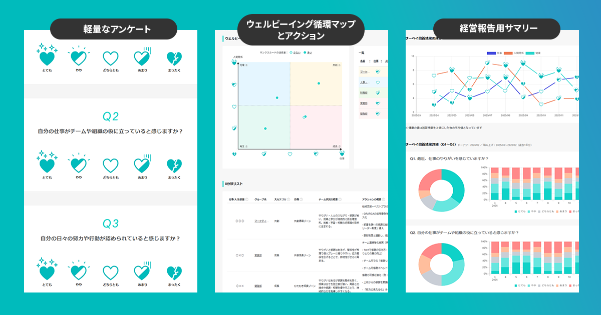 私たちは、こうした変化を組織の状態として可視化し、対話や改善アクションにつなげるため、感謝データと軽量サーベイを組み合わせたGRATICAの新サービス「組織サーベイ」を開発しました。