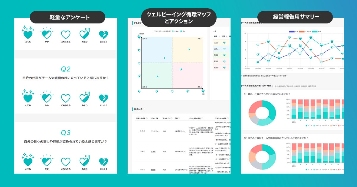 本サービスは、エンゲージメント向上施策の次の打ち手として、「関係の質」に着目した新しいアプローチで、感謝データと軽量サーベイをもとに組織の状態を可視化し、改善アクションや経営報告につなげるものです。
