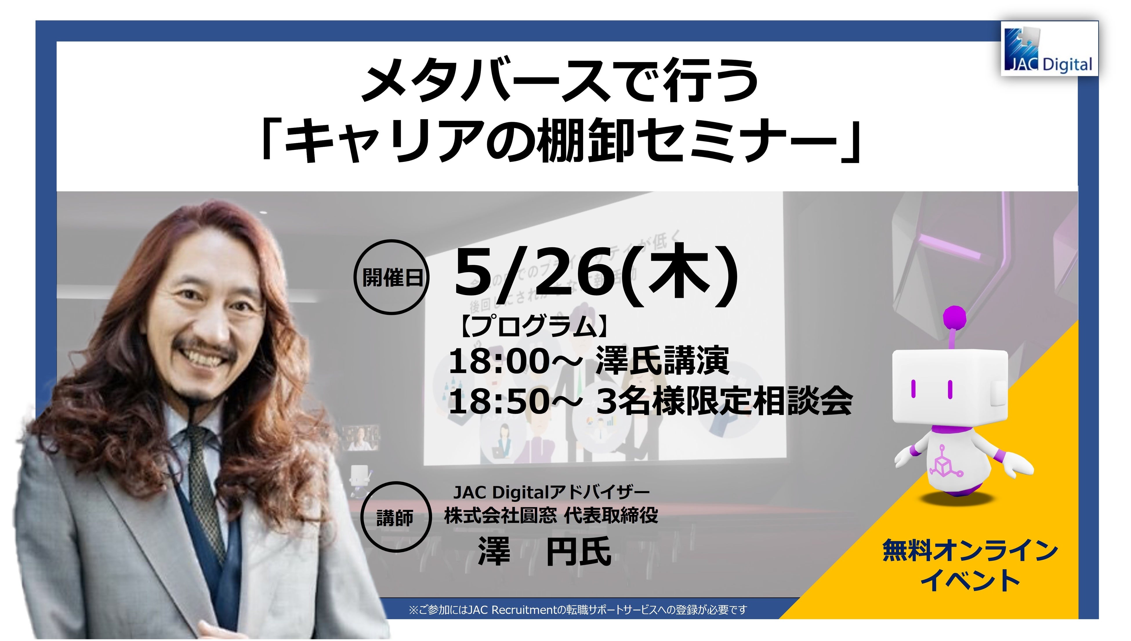 世界11ヵ国で人材紹介事業を展開する業界大手の株式会社 ジェイ エイ シー リクルートメント(代表取締役会長兼社長:田崎 ひろみ、本社:東京都千代田区)は、メタバースで行う「キャリアの棚卸セミナー」と題したオンラインセミナーを5/26(木)に開催いたします。