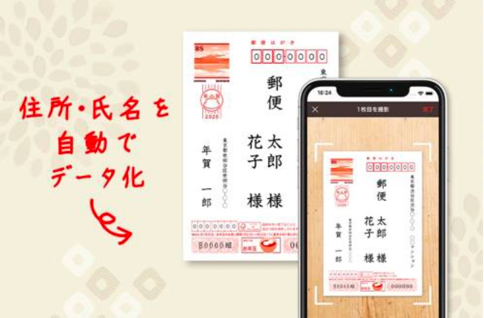 スマートフォンアプリ「スマホで写真年賀状」の「宛名スキャン」機能を使ってお手元のはがきを撮影するだけ。通常1~2日以内に宛名情報を自動でデータ化し、アプリ内の「宛先帳」に登録できる便利な機能が登場。もちろん利用料金はかかりません。忙しい子育てファミリーのための応援機能です。