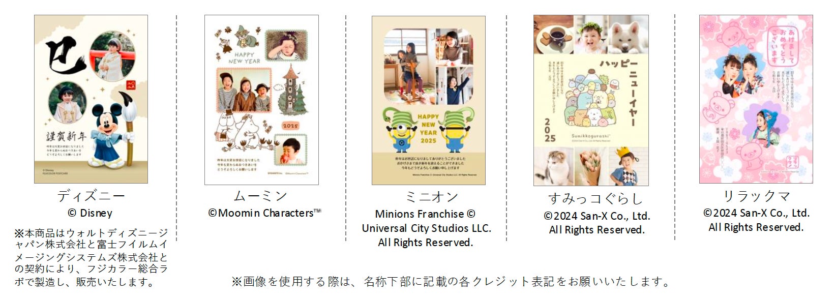 今年も「スマホで写真年賀状」では、「ディズニー」「ミニオン」「ムーミン」「すみっコぐらし」といったお子様からの人気も高い有名キャラクターとのタイアップデザインを多数提供します。キャラクターファンの方だけでなく、お子様がお友達に出す用のデザインとしてもご活用いただけます。