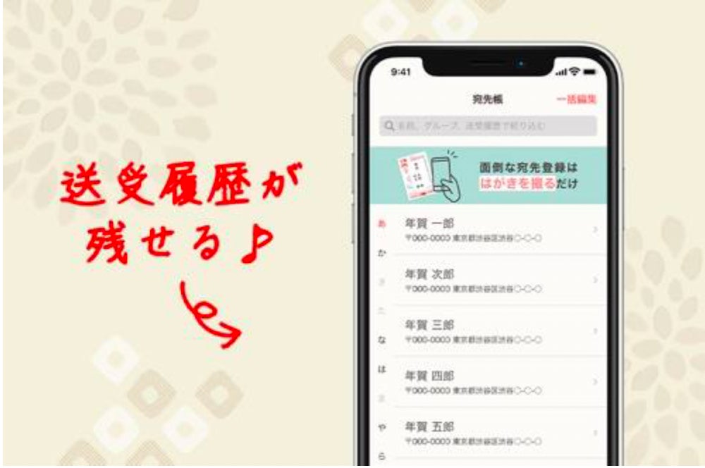 スマートフォンアプリ「スマホで写真年賀状」でご注文いただいた宛先分は「宛先帳」の送付履歴にデザインと合わせて自動で残るようになりました。
