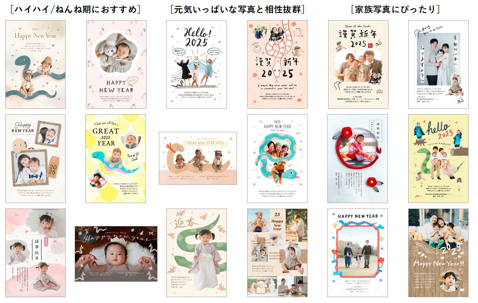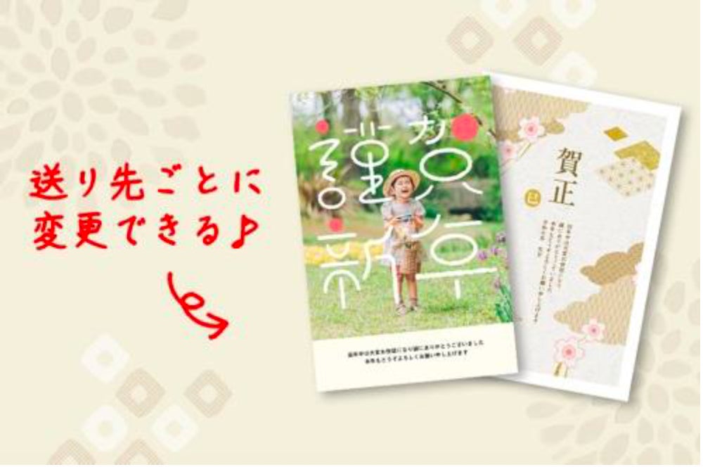 子育てファミリーにうれしい、お子様の写真が映えるデザインが充実しています。シンプル、かわいい、和風などお好みや写真の雰囲気にあわせて選べる豊富なバリエーションを今年もご用意しています。