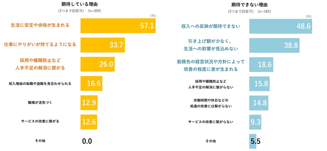 また、期待する理由では「生活に安定や余裕が生まれる(57.1%)」に次いで「仕事にやりがいが持てるようになる(33.7%)」が上位となっています。「採用や離職防止など人手不足の解消に繋がる(26.0%)」という回答も約3割弱あり、仕事のモチベーション維持や現場の人員確保には給与の引き上げが必要だと考えられていることがわかります。