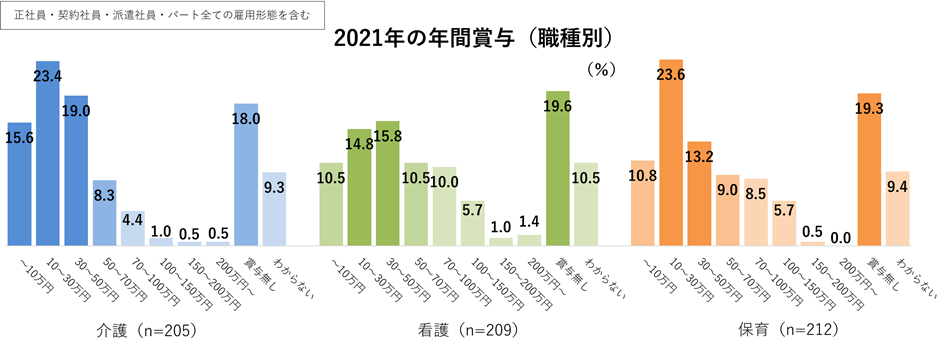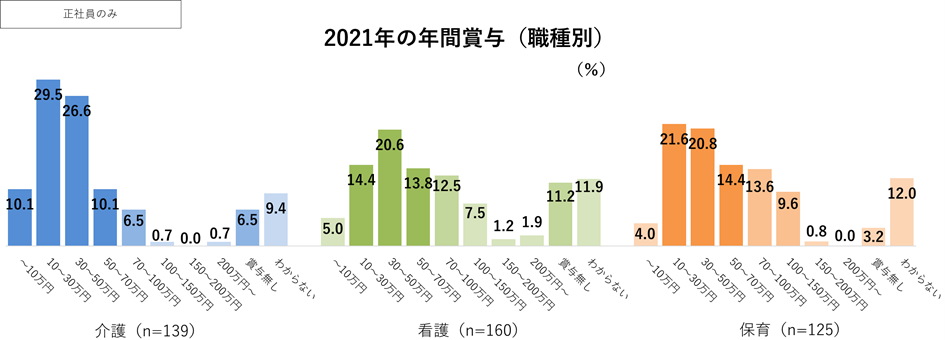 ・全職種において年間賞与額のボリュームゾーンは10万円~50万円。介護職では半数以上(57.0%)が30万円未満という結果に
