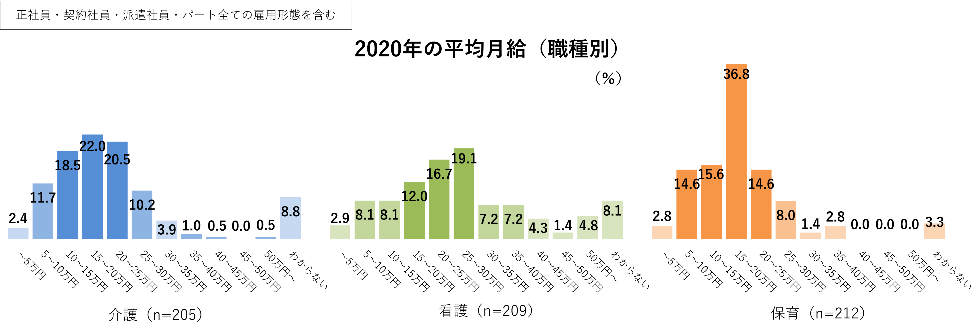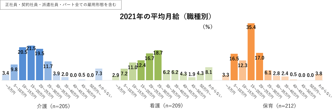 2021年の平均月給の分布は、介護・保育職では「15万円~20万円未満(介護21.5%・保育35.4%)」、看護職では「25~30万円(18.7%)」がトップ。