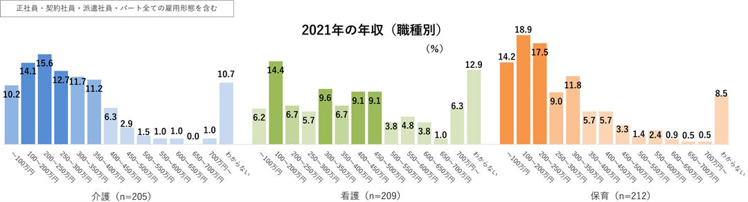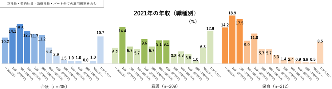 各職種の年収をみると、400万円以上の層が介護職13.7%、看護職37.9%、保育職14.7%となっています。すべての職種の年収において、2020年の全産業平均年収である433万円に届く層が少ないことがわかります。