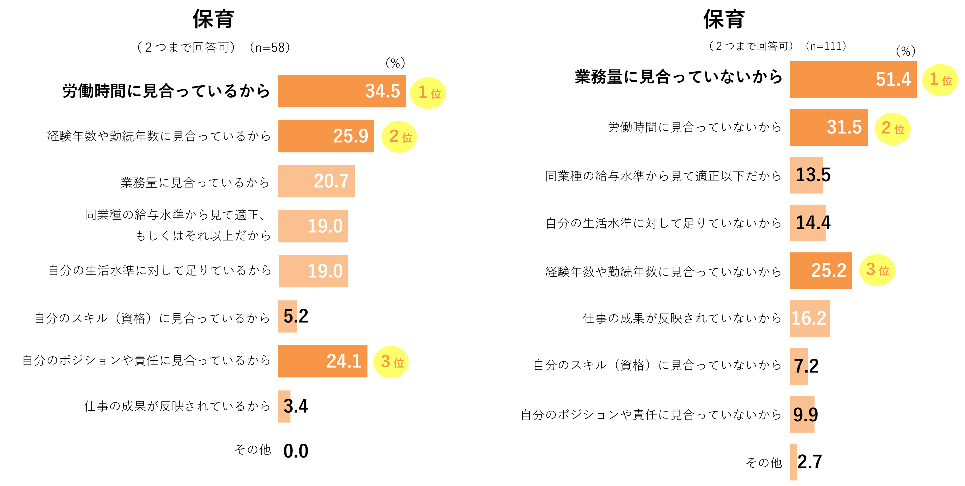 ・3職種ともに約半数(介護職51.2%・看護職49.8%・保育職52.3%)が現在の給与に「不満」と回答。不満を感じる理由では、すべての職種で「業務量に見合っていないから(介護職45.7%・看護職38.5%・保育職51.4%)」がトップに