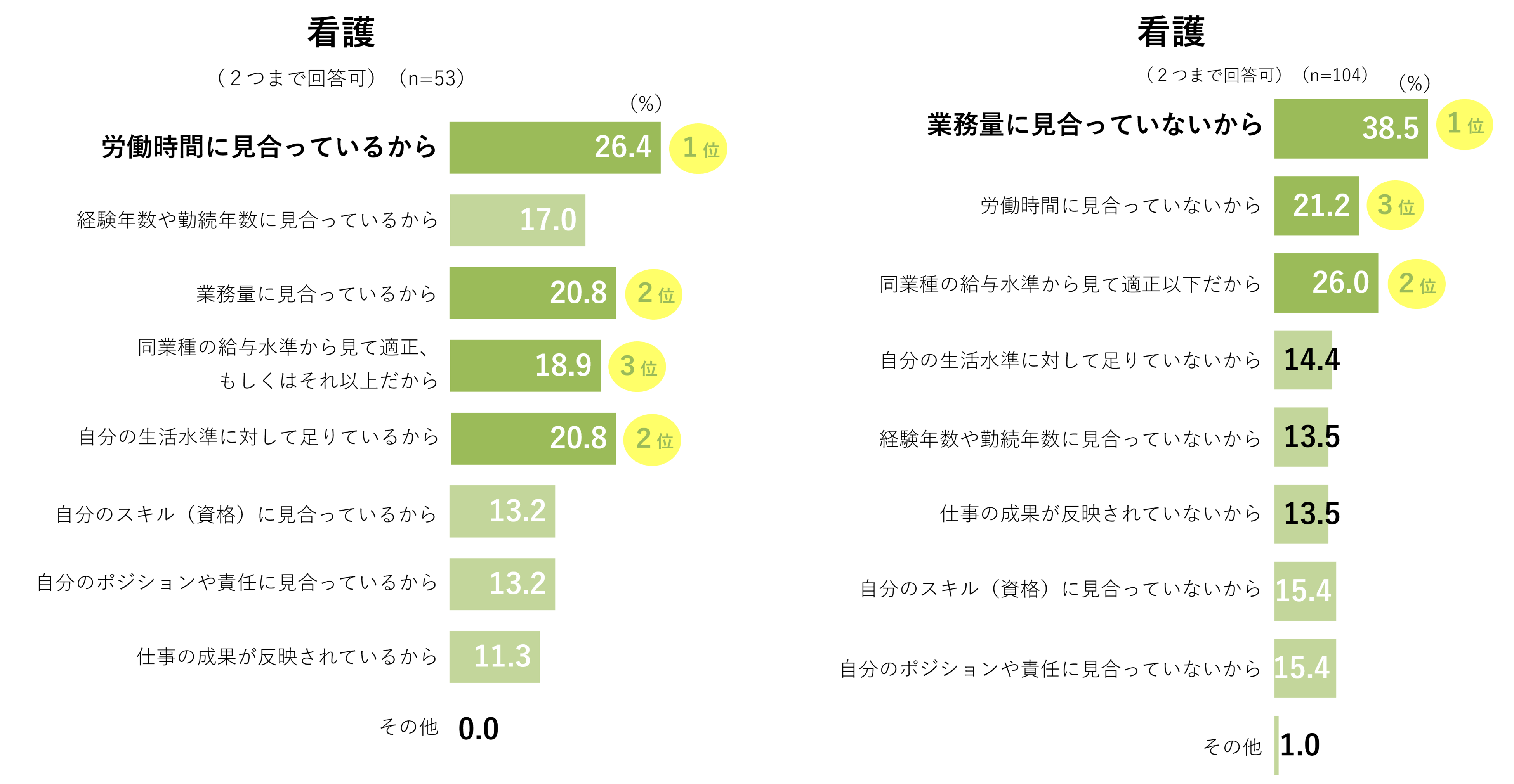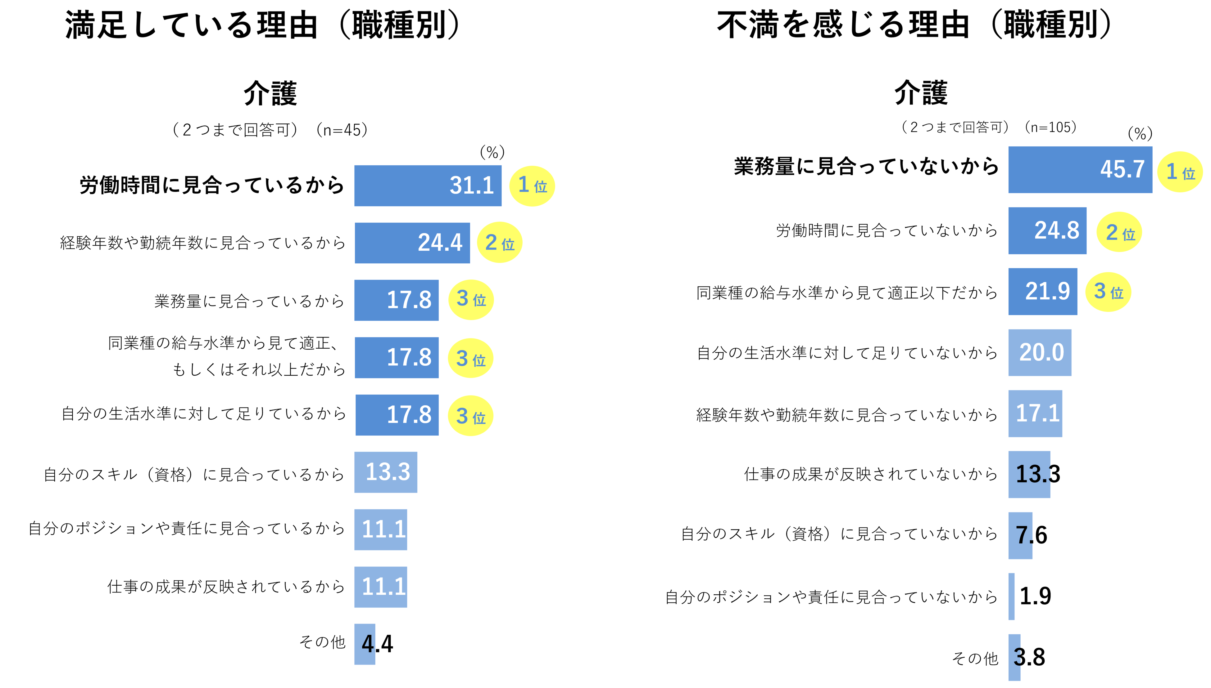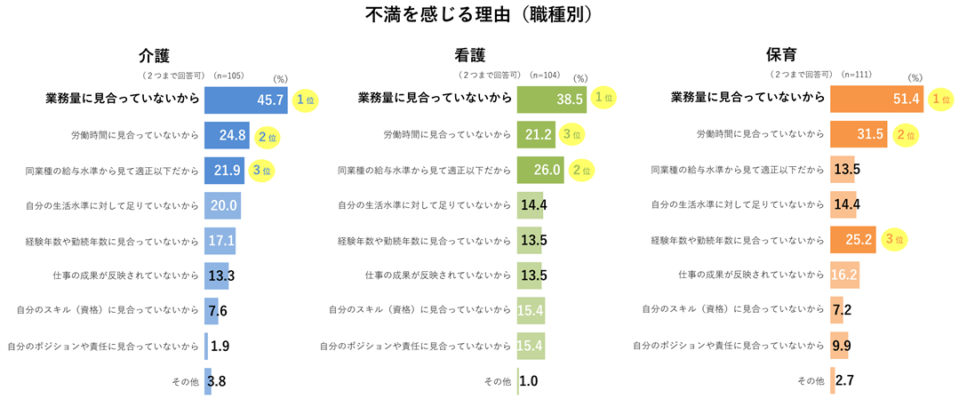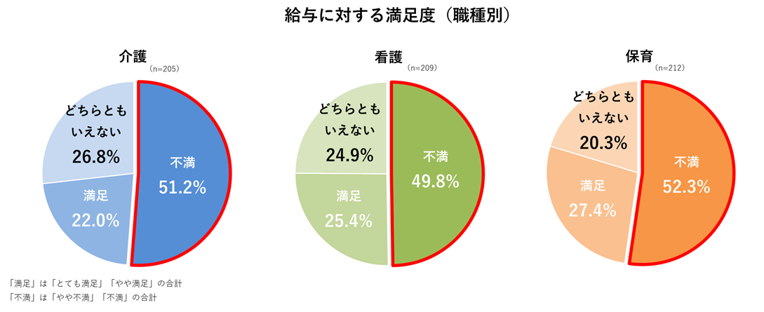 3職種ともに約半数(介護職51.2%・看護職49.8%・保育職52.3%)が現在の給与に「不満」と回答。不満を感じる理由では、すべての職種で「業務量に見合っていないから(介護職45.7%・看護職38.5%・保育職51.4%)」がトップに。