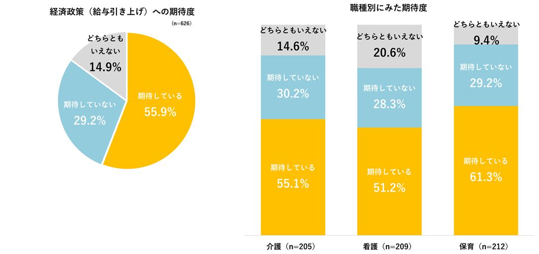 【介護・看護・保育職の給与実態調査】全体の55.9%が「給与引き上げ」の経済政策に期待、一方で期待しない人の約半数が「収入への反映が期待できない」と回答