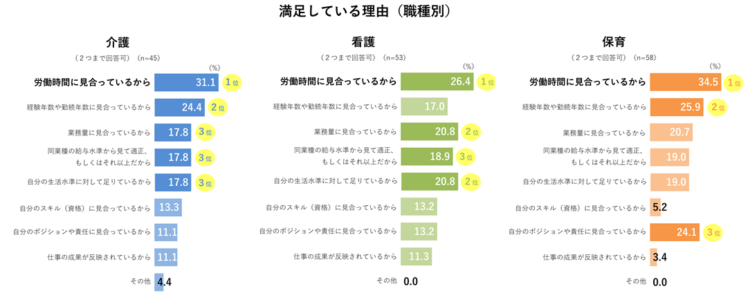 不満を感じる理由では、1位の「業務量に見合っていないから」に次いで「労働時間に見合っていないから(介護職24.8%・看護職21.2%・保育職31.5%)」も上位になっています。一方で、満足する理由の上位にも業務量や労働時間が挙がっています。「業務量の多さ」「労働時間の長さ」は、医療・福祉職の離職理由として上位に挙がることが知られています。本回答から、業務実態に見合った待遇や給与支給が職員の満足度に影響することがわかります。