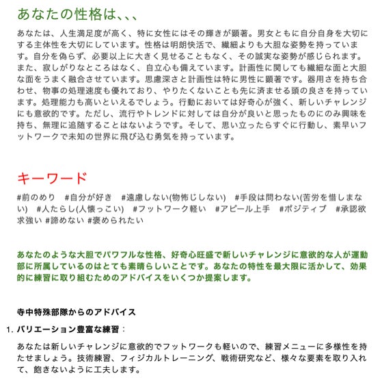 この度、性格診断パターンをベースに、寺中特殊部隊監修の元、パーソナライズされたトレーニングのアドバイス機能を構築し、アスリートには、性格に合わせた効果的なトレーニングのアドバイスを、指導者には性格ごとの指導方法のアドバイスを提供し、効率の良いスキルアップ、パフォーマンスの最大化が期待できます。