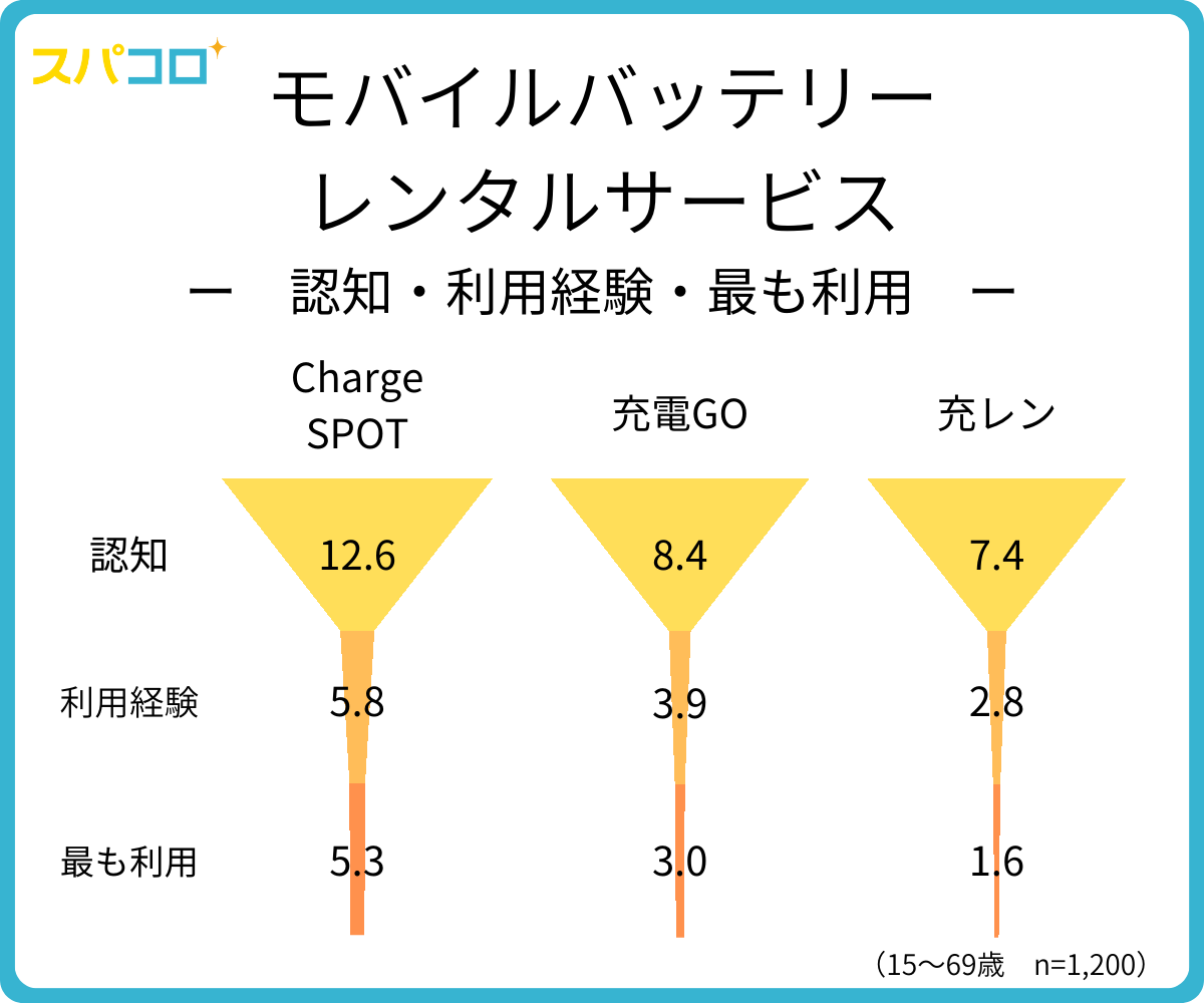認知から利用のいずれでも「ChargeSPOT」が1位となっていることがわかりました。一方で1位の「ChargeSPOT」でも認知1割、利用1割未満と、モバイルバッテリーのレンタルサービス自体がいまだ認知・利用ともに広がっていないことが伺える結果となりました。