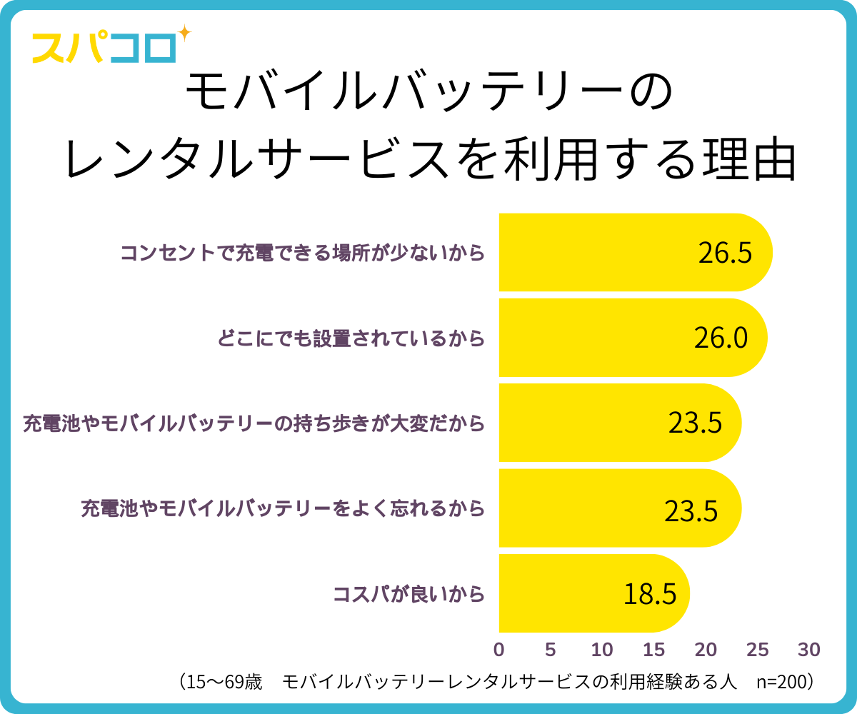 モバイルバッテリーのレンタルサービスを利用する理由TOP5は、「コンセントで充電できる場所が少ないから」(26.5%)、「どこにでも設置されているから」(26.0%)、「充電池やモバイルバッテリーの持ち歩きが大変だから」(23.5%)、「充電池やモバイルバッテリーをよく忘れるから」(23.5%)、「コスパが良いから」(18.5%)でした。