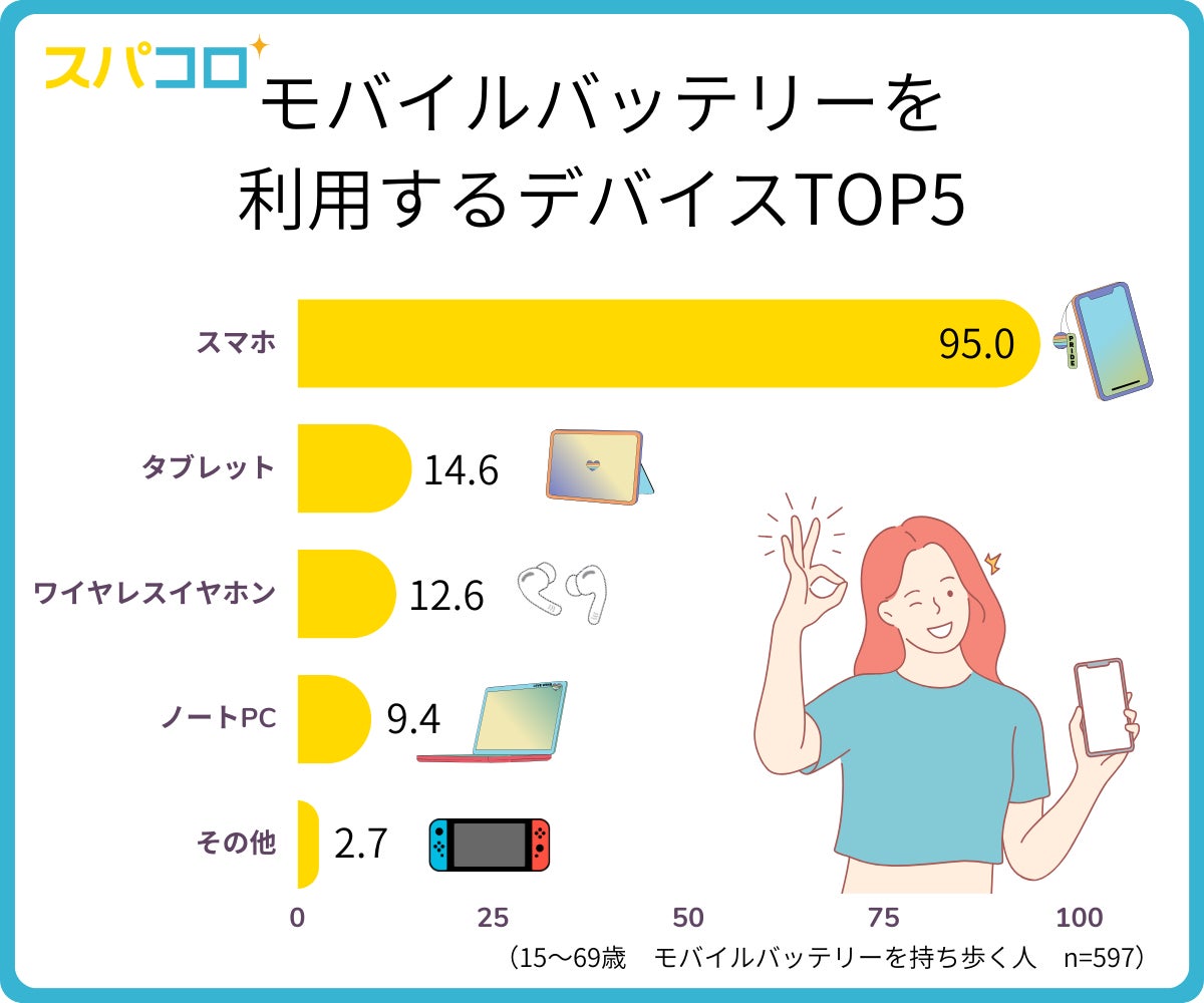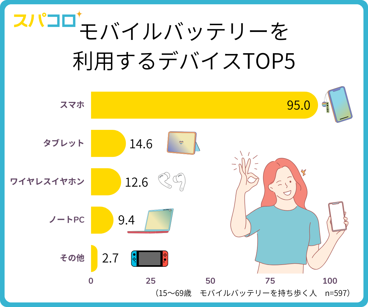 充電機器を利用するデバイスTOP5は「スマホ」(95.0%)、「タブレット」(14.6%)、「ワイヤレスイヤホン」(12.6%)、「ノートPC」(9.4%)、「その他」(2.7%)でした。