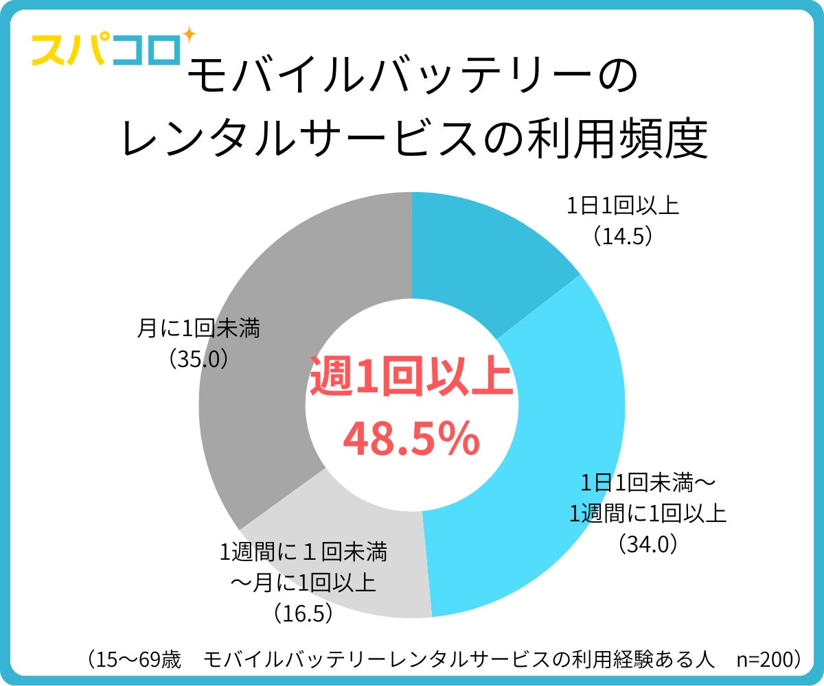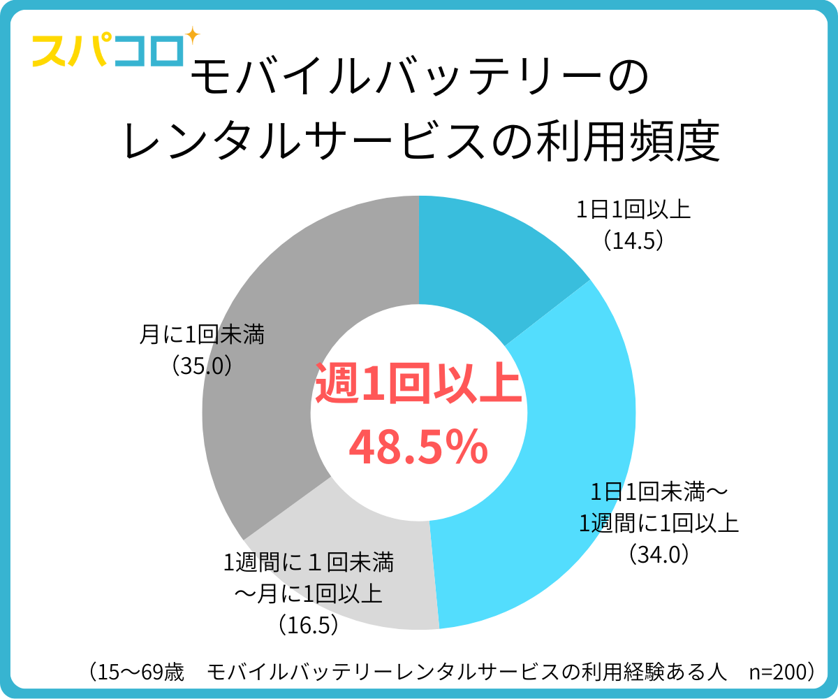 モバイルバッテリーのレンタルサービス利用者の利用頻度は、「1日1回以上」(14.5%)、「1日1回未満~1週間に1回以上」(34.0%)、「1週間に1回未満~月に1回以上」(16.5%)、「月に1回未満」(35.0%)でした。