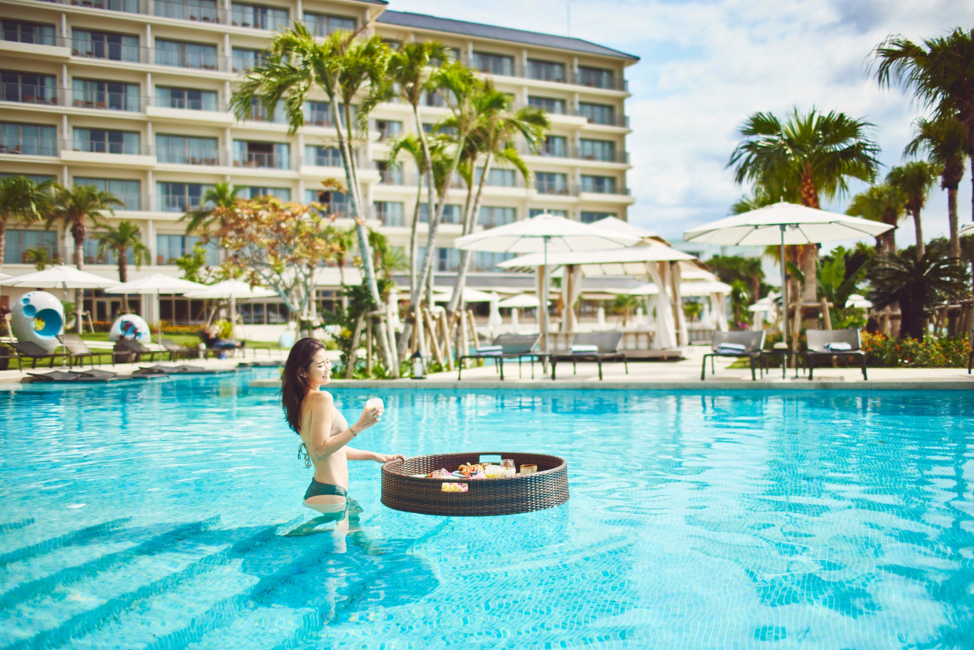 “浮かぶ朝食(Floating Breakfast)”を意味し、プールに浮かべた大きなトレーには、エッグベネディクトをはじめ、色鮮やかなフルーツ、スモークサーモンや旬野菜、アサイーボウル、自家製ペストリーやフレッシュジュース、淹れたてのコーヒーなどが並び、フォトジェニックで栄養満点なラインナップです。この朝食を楽しむために来島いただくゲストも数多い、当リゾート宿泊ゲスト限定にて提供する眼福なオファーで、エネルギッシュな一日のスタートを。