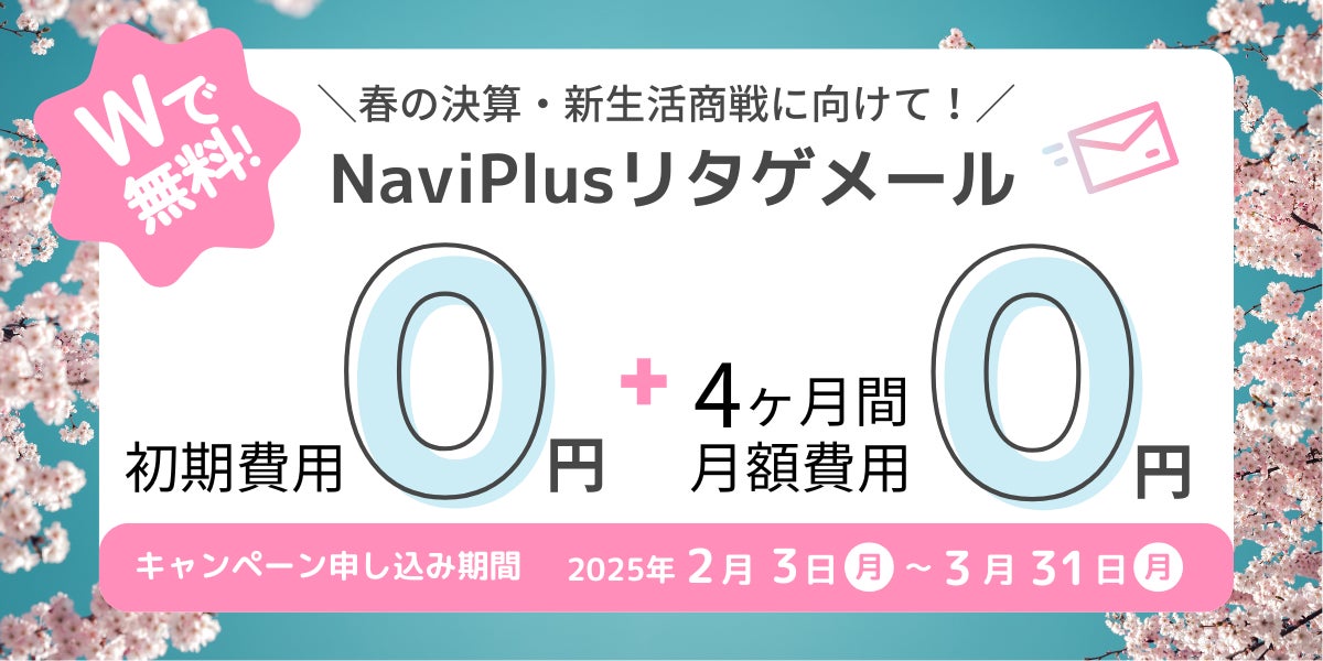 EC向けマーケティングソリューションを提供するナビプラス株式会社(デジタルガレージグループ会社 / 本社:東京都渋谷区、代表取締役:清水 和徳、以下:ナビプラス)は、フォローメール配信サービス「NaviPlusリタゲメール」において、初期費用と月額費用が4ヵ月無料となるキャンペーンを2025年2月3日(月)より開始します。