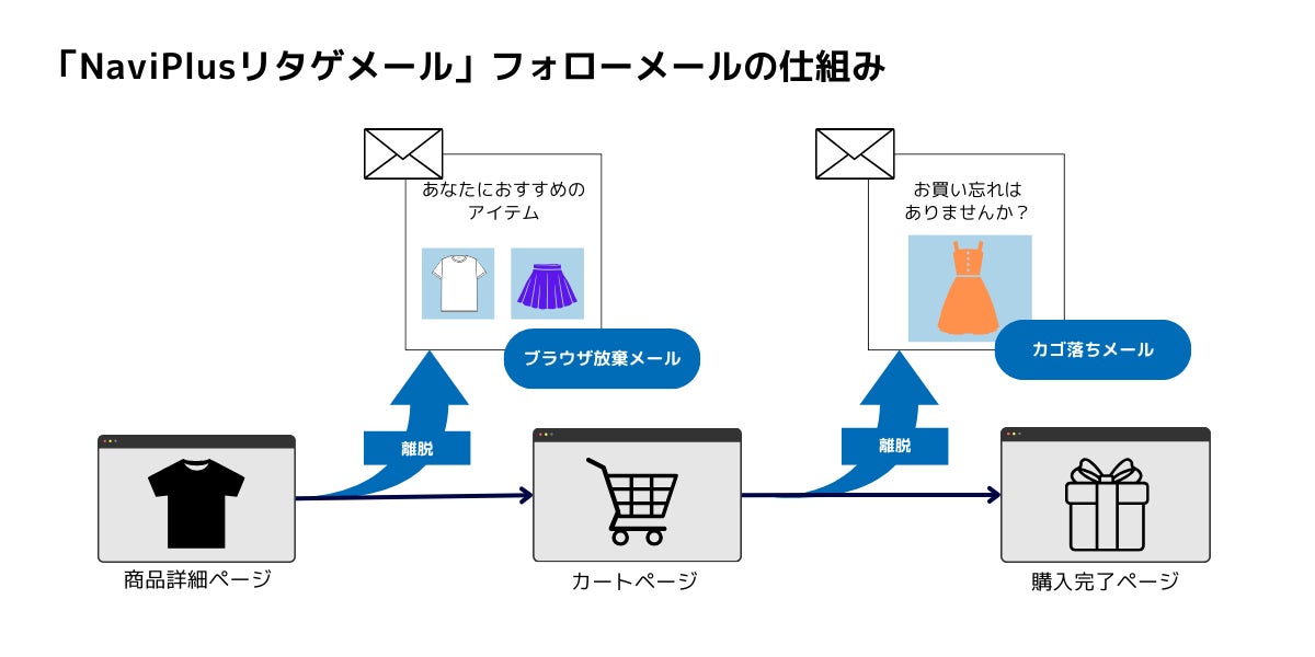「NaviPlusリタゲメール」は、ECサイトに訪問したユーザーの行動に基づき、タイミングに合わせてリアルタイムにフォローメールを配信するサービスです。商品詳細ページを閲覧したり、カートに商品を追加したものの、購入に至らなかったユーザーに対して、閲覧商品やおすすめ商品を紹介するフォローメールを自動で送信し、サイトへの再訪問を促すことで、売上機会の最大化を図ります。