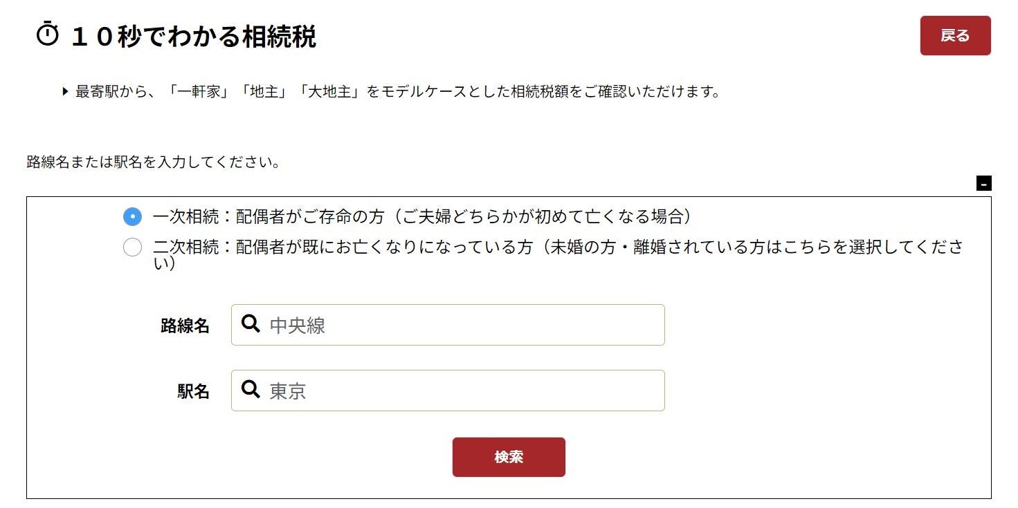 使い方は簡単で、相続税を計算したい方がお住いの最寄り駅(※)を入力していただくと、その地域の路線価と一般的な保有資産から概算相続税額を計算いたします。時間にしてわずか10秒です。