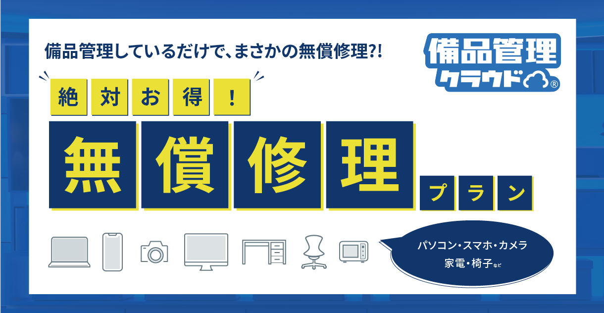 備品管理クラウドに登録するだけでメーカー保証切れのIT機器・家電全般・オフィス家具・カメラ類などほとんどの備品の無償修理が可能に!なんでもカバーできる驚きのサービスを開始。
