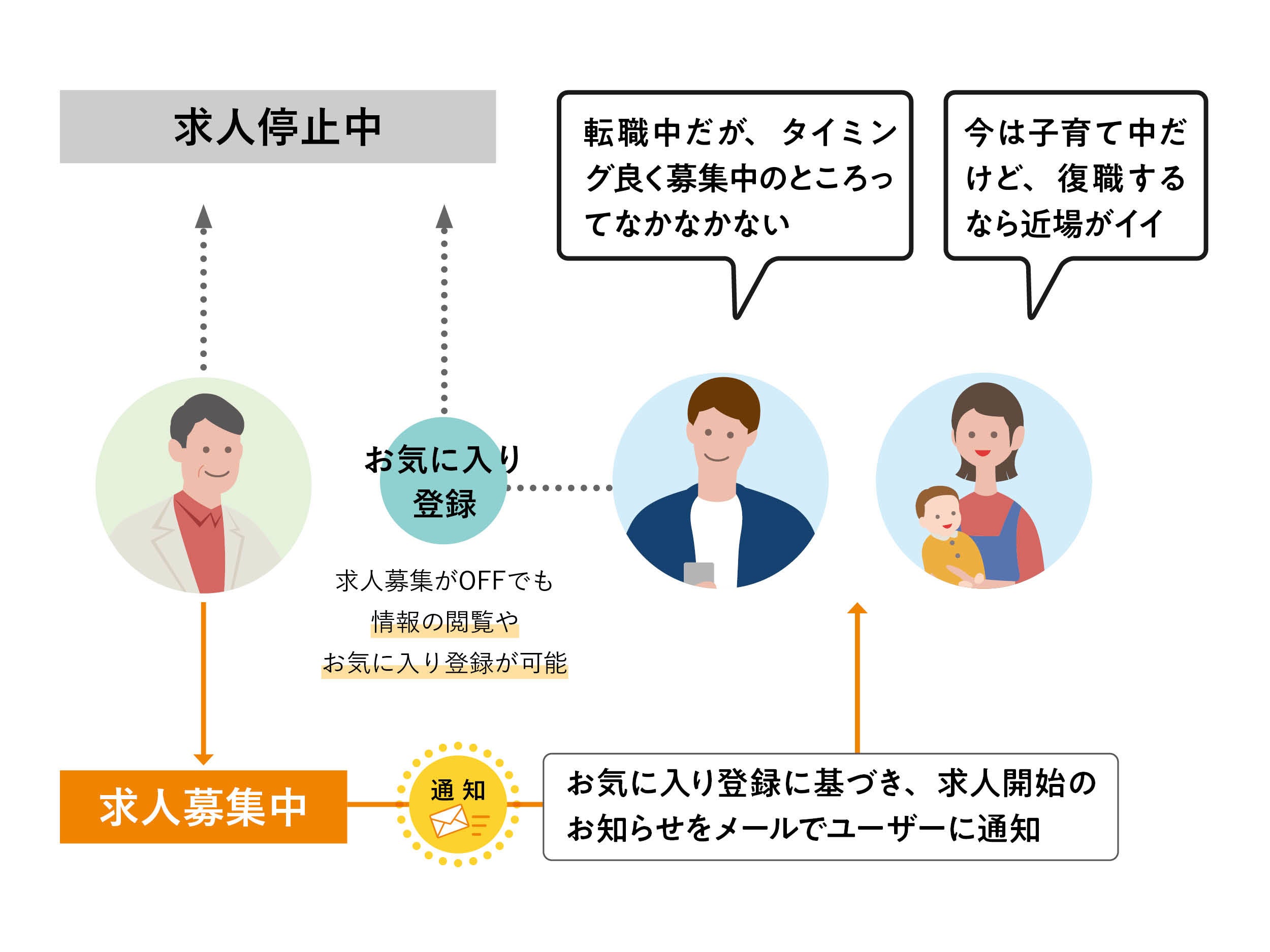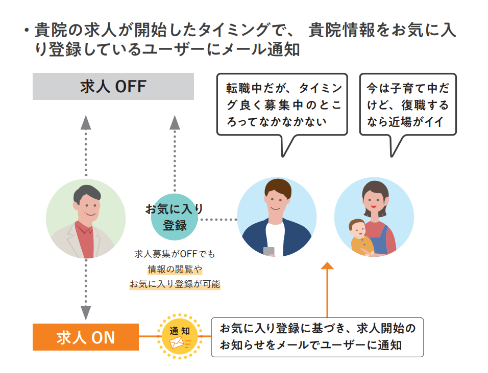 「おすすめ求人」機能で条件にマッチしたユーザーに貴院情報をレコメンするだけでなく、求人が開始したタイミングで、貴院情報をお気に入り登録している求職者にメールで通知を飛ばす機能を搭載。「タイミングさえあえばここで働いてみたい」という求職者と「良い人がいれば採用したい」という医療機関、双方をタイミングを逃さずマッチングすることを実現します。