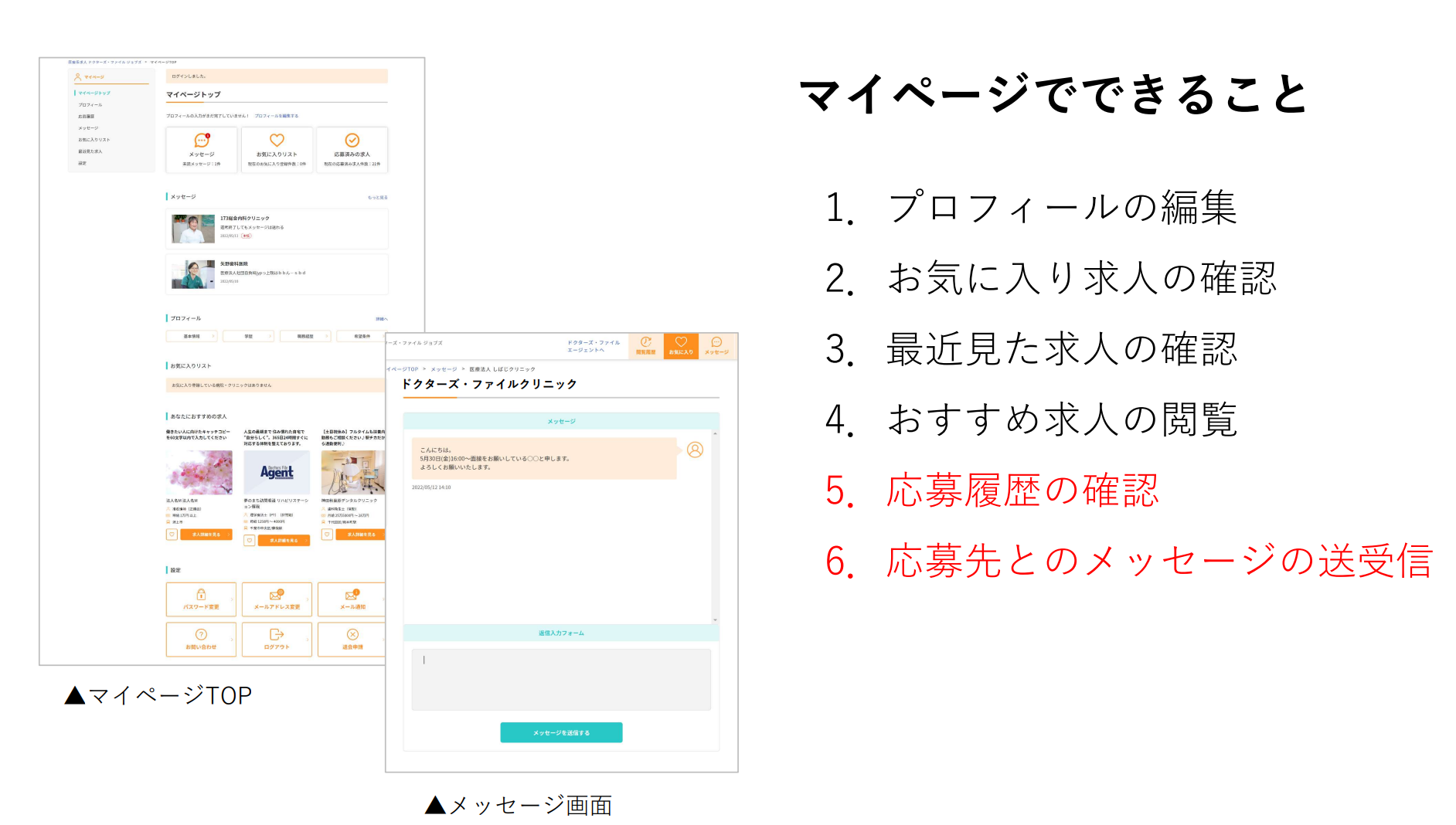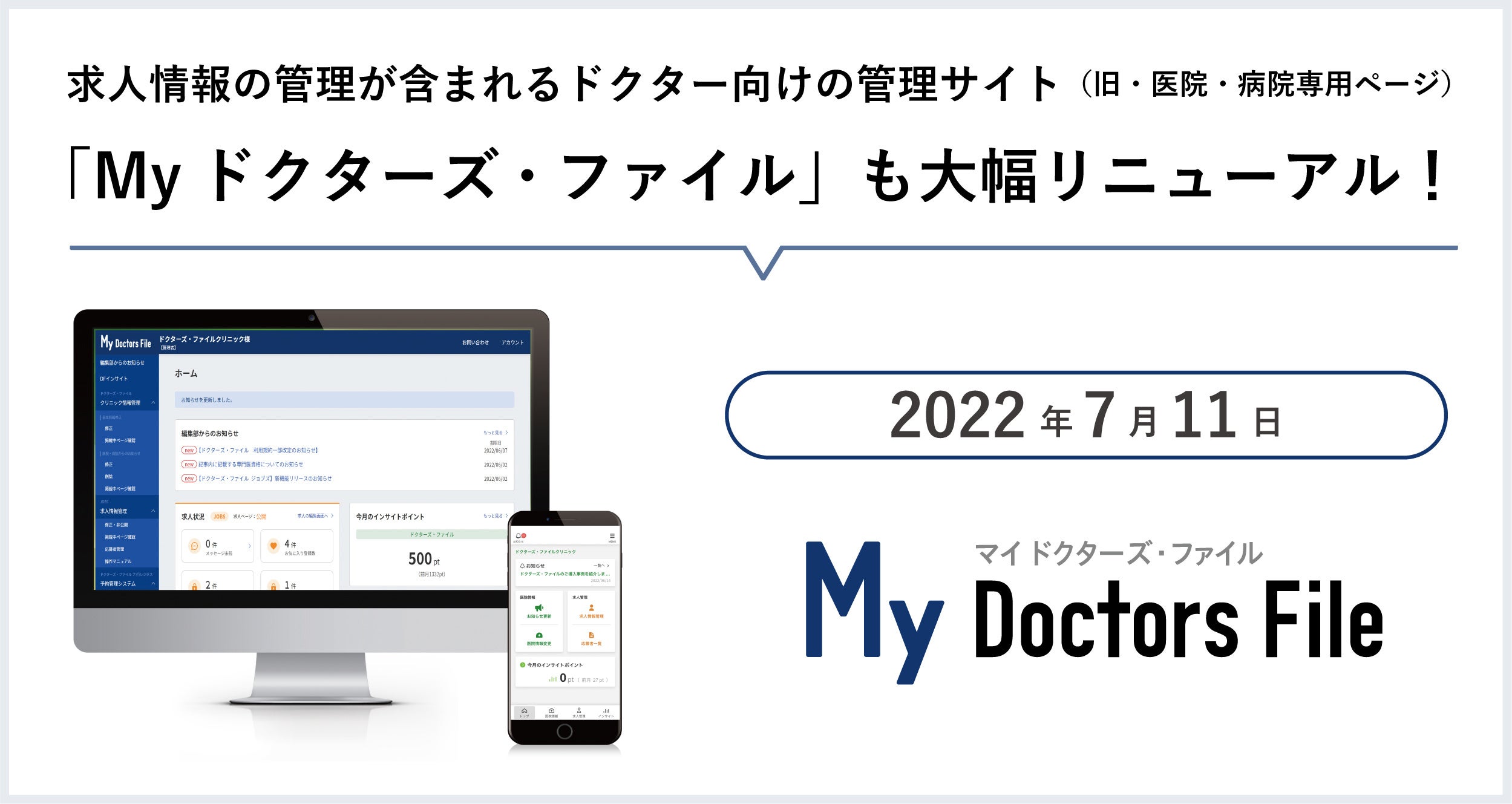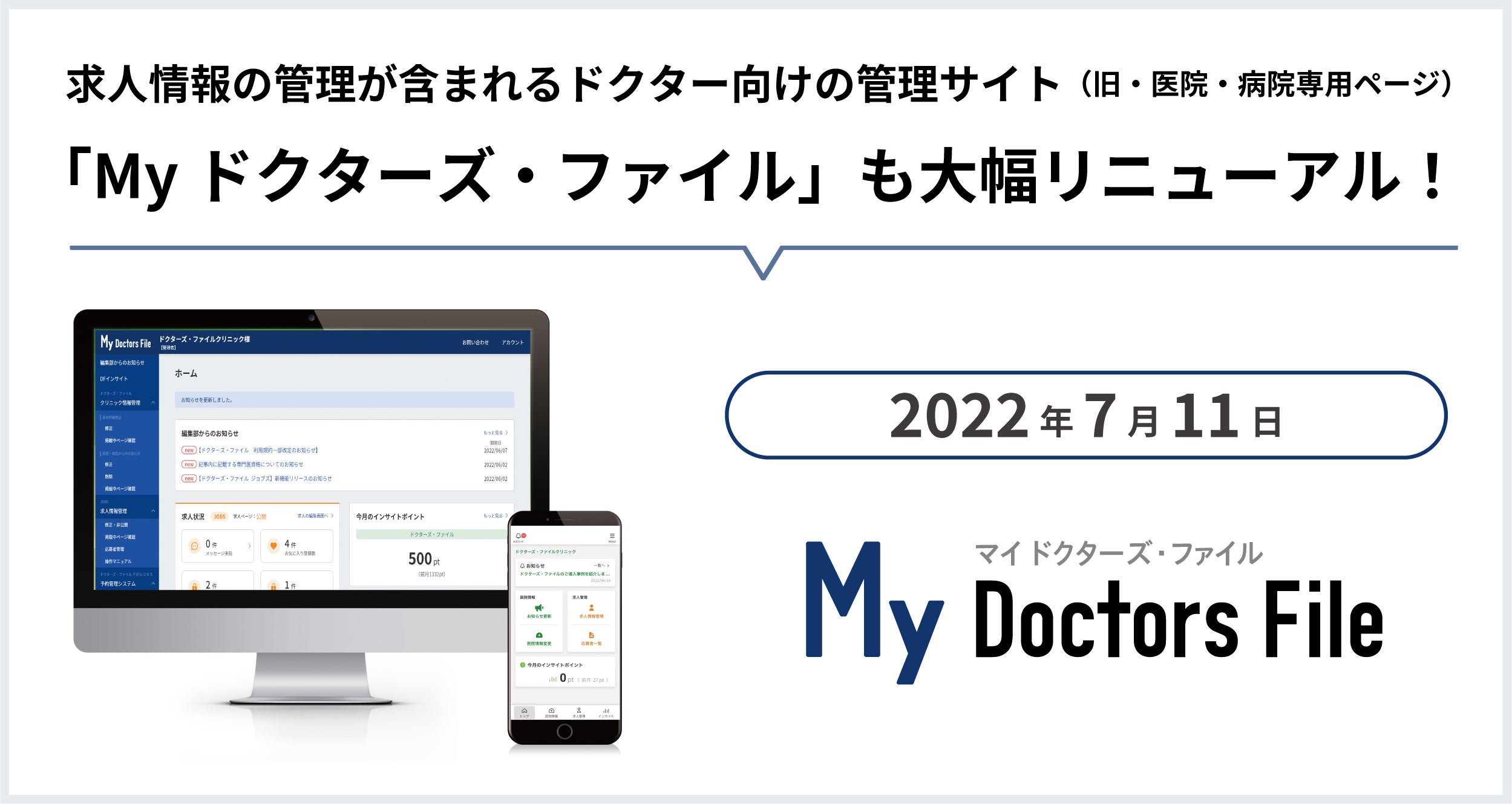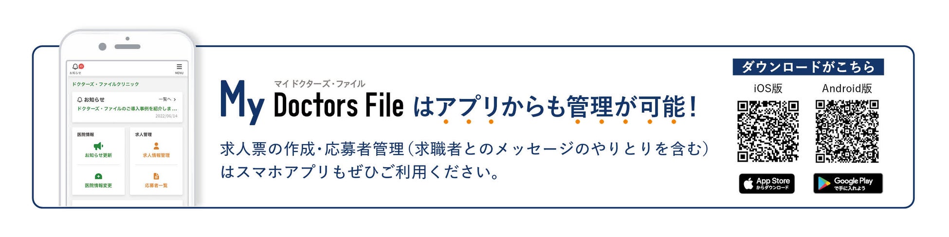 「My ドクターズ・ファイル」は、求人情報の管理機能が搭載された、医療機関向けの管理サイト です。求人情報サイト「ドクターズ・ファイル ジョブズ」の情報管理だけでなく、総合医療情報サイト「ドクターズ・ファイル」に掲載する情報の管理もPC、スマホアプリから手軽に行えます。今回のリニューアルを踏まえ、見やすくそしてより使いやすいサイトへと進化しています。
