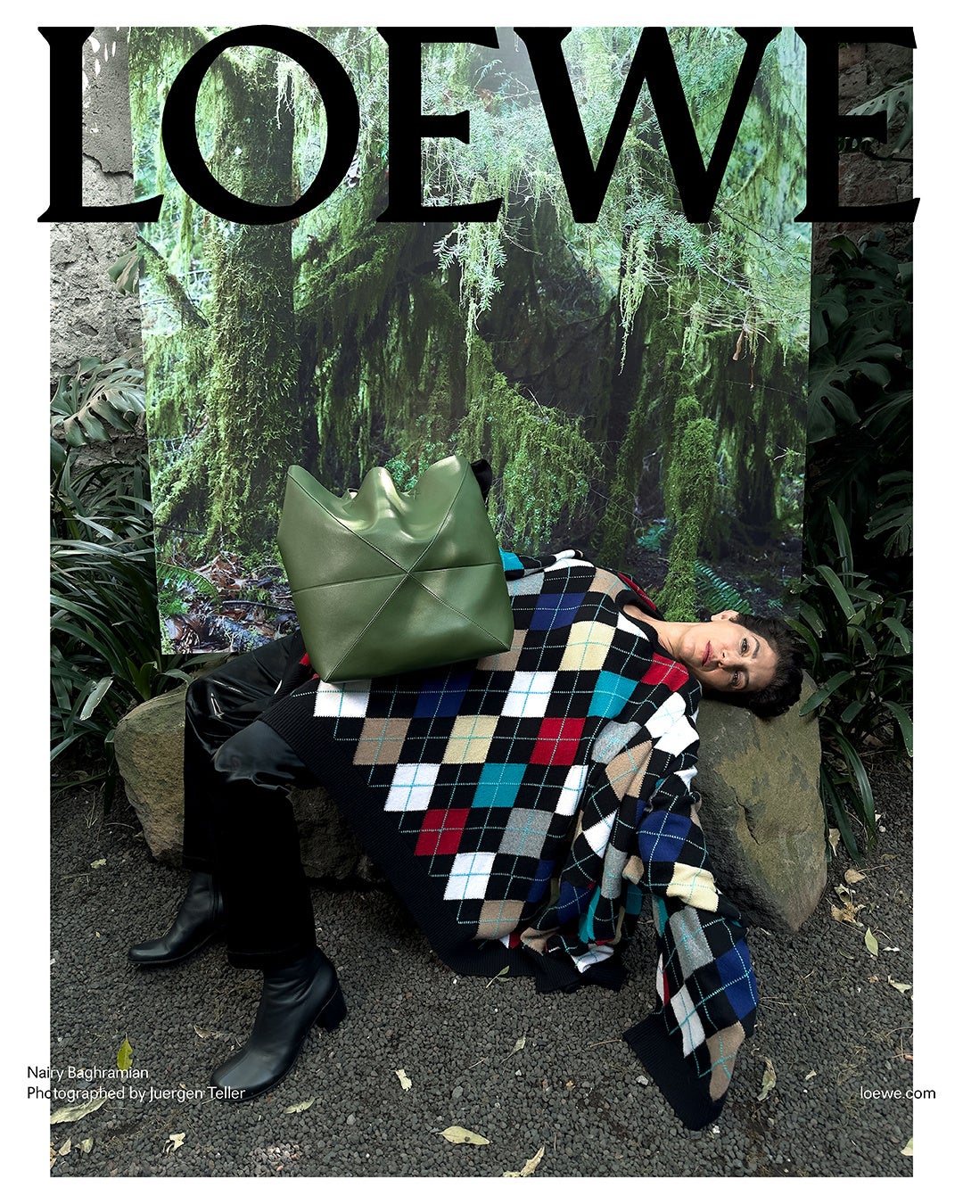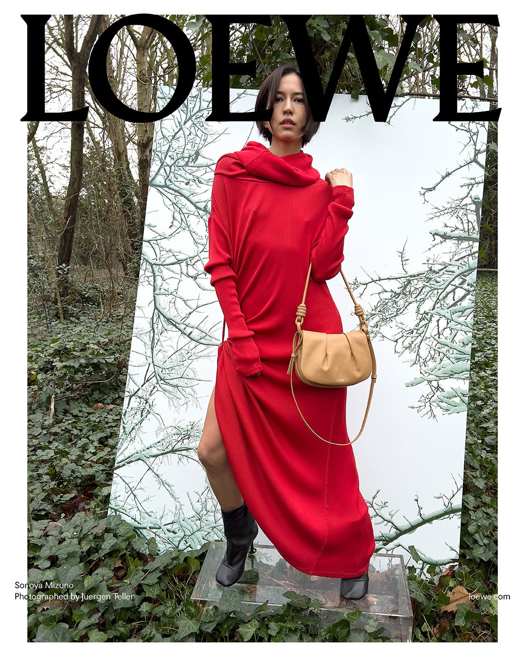 ポーズやシチュエーションは粗野でありながら遊び心があり、端正なフォルム、巨大なリボンや突き出たボディなどの大胆なディテール、そして彫刻的な本質主義が交錯するプレコレクションのシルエットを反映し、際立たせています。パズルやパセオ、フォントトートなど、ロエベを代表するバッグが、新たなバリエーションやカラー、サイズで登場します。また、ソノヤ・ミズノが履くトイブーツの、オブジェ・トゥルーヴェのヒールと花びらのようなペタルトゥ、マレー・バートレットが履くブラッシュ・スエードのチェルシーブーツの誇張したトゥなど、シューズは今やロエベを象徴するキーディテールを備えています。
