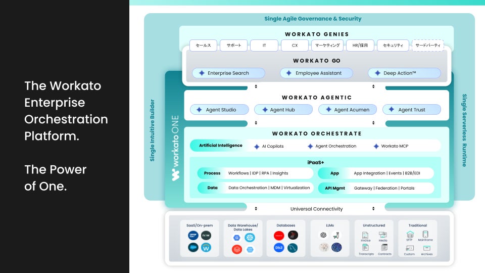 Workatoは、テクノロジーの複雑さをビジネスチャンスへと転換します。リーディング・エージェンティック・オーケストレーション企業として、Workatoは企業のデータ、プロセス、アプリケーション、そしてエクスペリエンスを連携・統合し、ビジネスの成長を支援します。AI主導のプラットフォームは、複雑なワークフローをリアルタイムで操作し、効率性と俊敏性を向上させます。12,000社以上のグローバル顧客から信頼されているWorkatoは、あらゆる規模の組織が新たな価値を創造し、今日の急速に変化する世界においてリーダーシップを発揮できるよう支援します。Workatoがあらゆる規模の企業のビジネス成長をどのように支援しているかについては、workato.comをご覧ください。