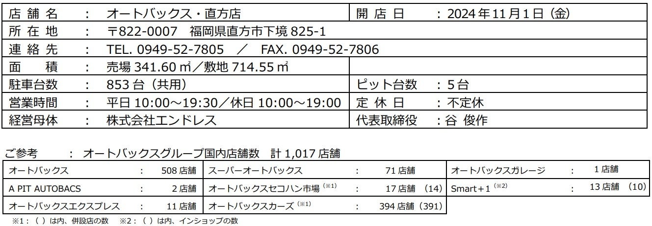株式会社オートバックスセブン(代表取締役 社長:堀井勇吾)と加盟店契約を結んでいる株式会社エンドレス(代表取締役:谷俊作)は、2024年11月1日(金)に「オートバックス・直方店」を新規オープンいたします。