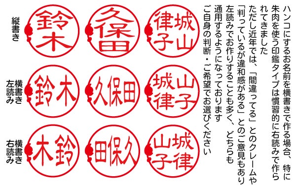 そのためお名前の書き方も一般的な印鑑同様、縦書き・横書き・フルネーム(2行)など柔軟に対応可能です。