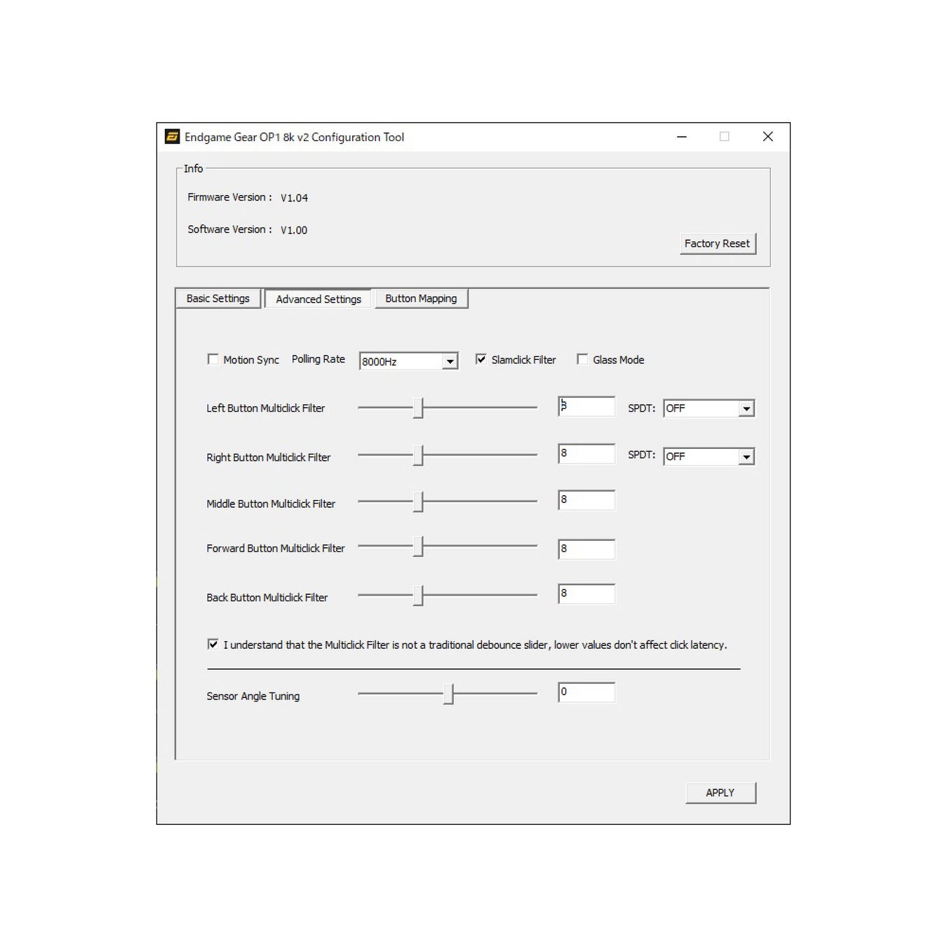 各ボタン設定、メインボタンのモード切替、マルチクリックフィルター、ポーリングレートやLOD設定等が行えるソフトウェアを用意。メーカー公式サイトからダウンロードして使用できる。