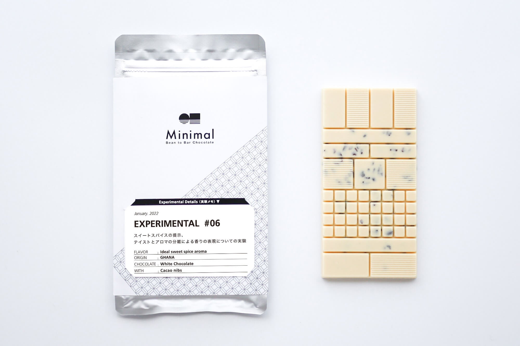 カカオ豆の可能性を追求した数量限定の板チョコレート「Experimental #06 -スイートスパイスの提示、テイストとアロマの分離による香りの表現についての実験-」がMinimalより2月1日発売