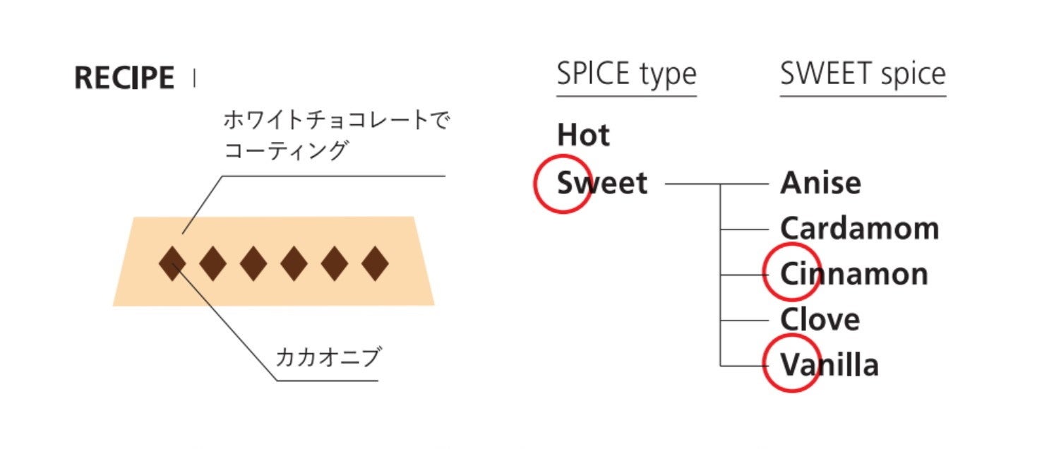 本製品にはシナモンやバニラなどは加えていません。スパイス自体に味わいはないため、香り(アロマ)を体験していただくチョコレートです。具体的なスイートスパイスの香りの記憶を持っていただければ実験成功です。