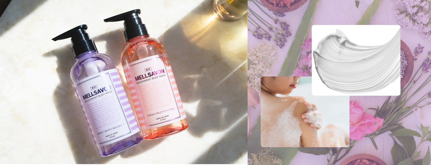 ・メルサボン デオドラントボディウォッシュ フレッシュフルーティーフローラル(右)