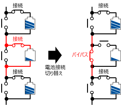 スイープ蓄電システムは、バイパス経路を形成するパワー基板と、電池状態を監視してバイパス経路をコントロールする制御基板によって構成されています。