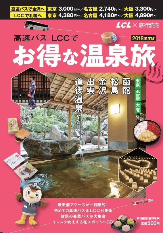 WEBサイト「夜行バス比較なび」「格安移動」「バスとりっぷ」を運営する株式会社LCL(本社:東京都中央区、代表取締役社長:村上公浩)と株式会社旅行読売出版社(所在地:東京都中央区築地、代表取締役社長:神崎公一、以下:旅行読売出版社)は、2016年に続く共同制作となる第2弾『高速バス・LCCでお得な温泉旅 2018年度版』(定価500円:税込)を1月18日(木)に発売しました。