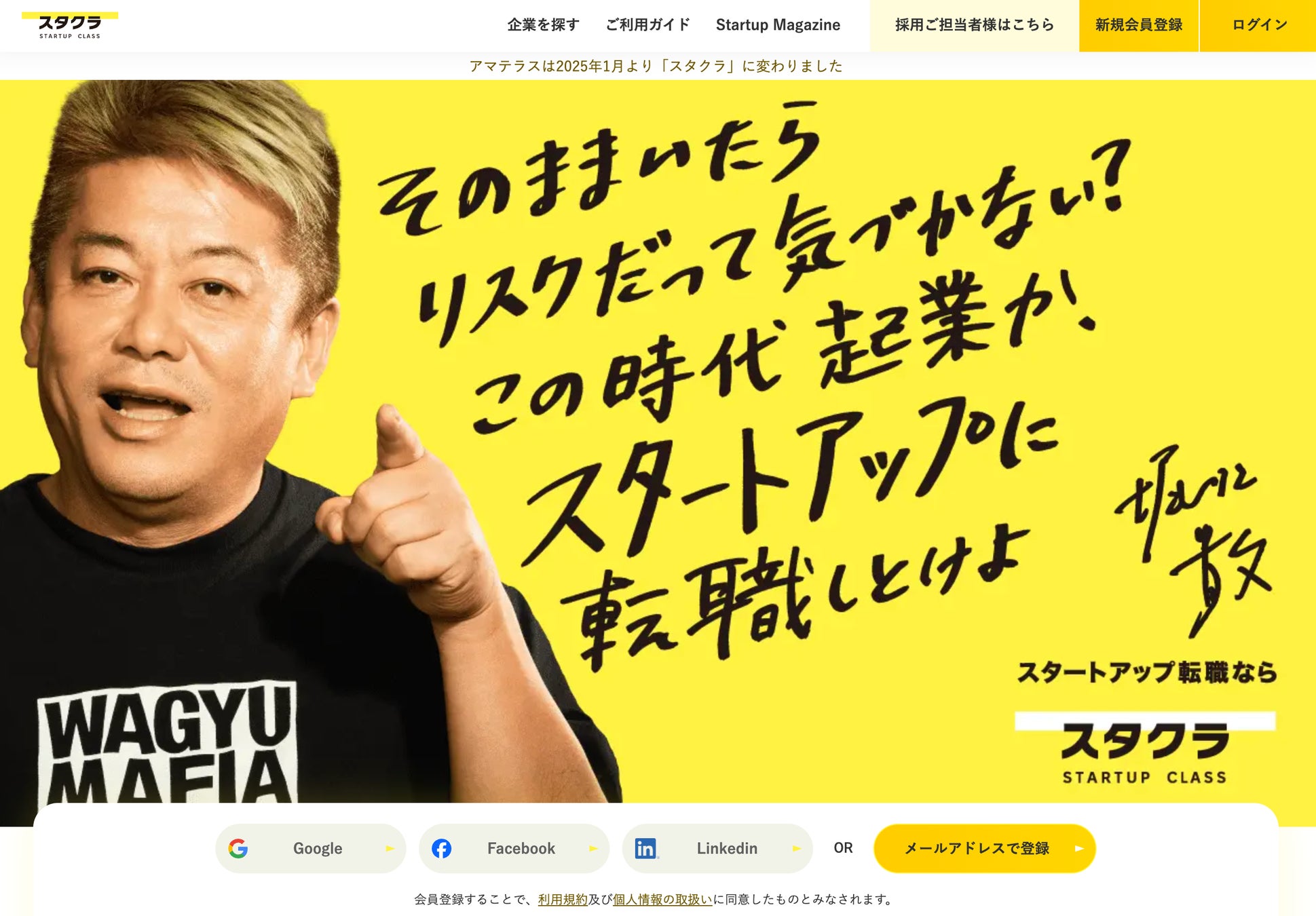 2011年よりスタートアップ専門の転職サービス『アマテラス』を展開してきた株式会社アマテラス(本社:東京都目黒区、代表取締役:藤岡清高、以下「当社」)は、社名を「株式会社スタートアップクラス」に変更しました。スタートアップ業界の人材不足やマッチングの精度の問題を解決すべく邁進していきます。また、イメージキャラクターに起業家の堀江貴文氏を起用し、「スタートアップクラス」というあたらしいキーワードを広げることで、スタートアップ転職のさらなる普及に励んで参ります。
