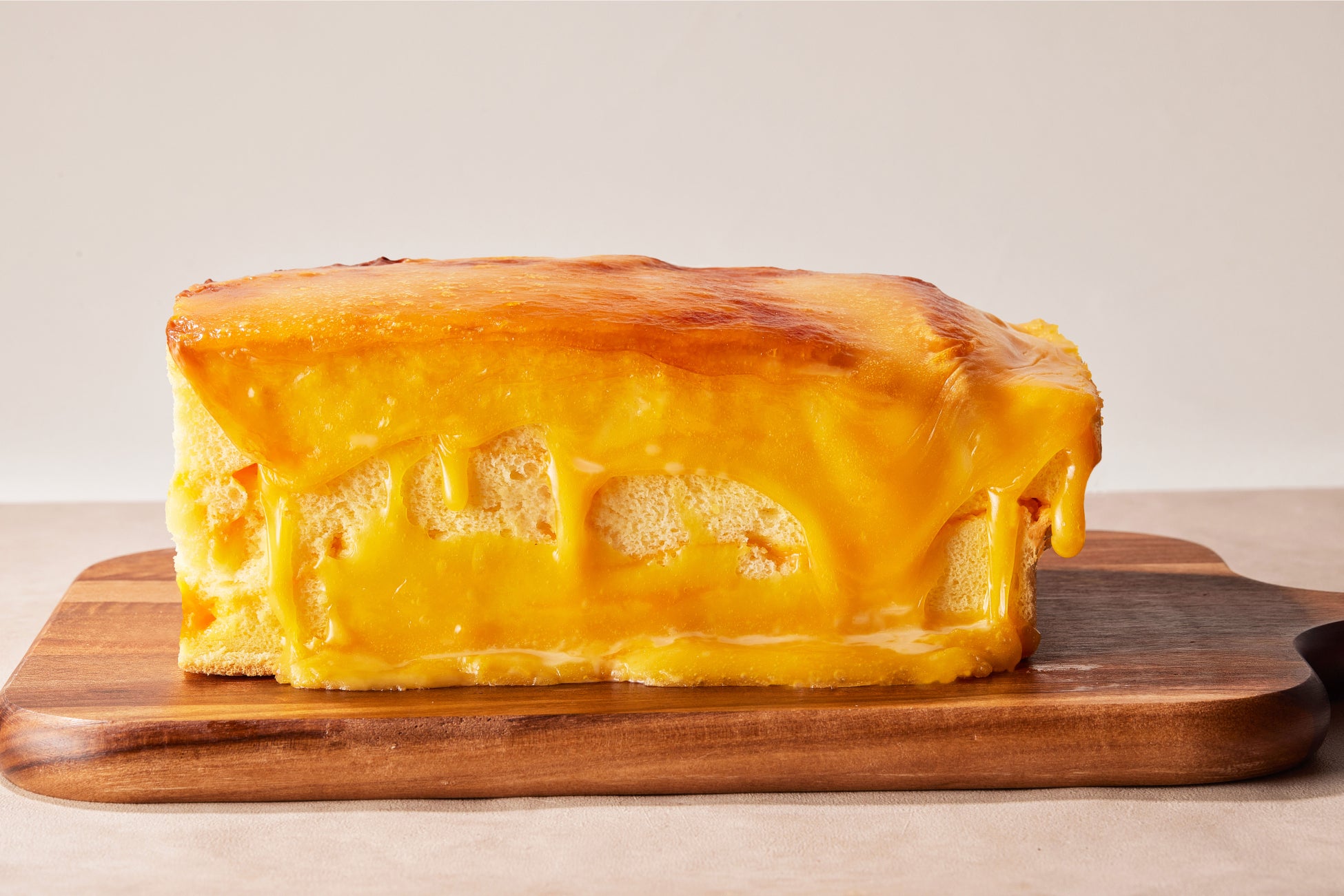 やわらかな台湾カステラ生地に、特別にブレンドしたチーズをたっぷりサンドし焼き上げました。焼きたて熱々のカステラ生地の断面からは、何層にも重なったチーズがトロリとこぼれ出ます。