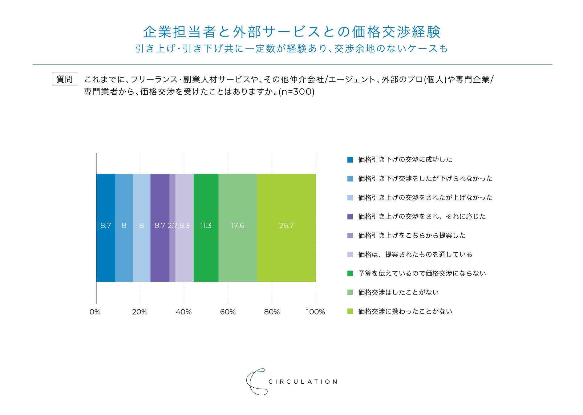内訳を見ると、価格引き下げ交渉の経験は16.7%、価格引き上げ交渉の経験は19.4%となり、実際に報酬を引き上げたのは11.4%でした。また、「提案されたものを通している」という担当者も8.3%いました。一方で「そもそも予算が決まっている」「価格交渉をしていない」という担当者も38.0%と多く、双方が予算を予め把握した上で、期待する成果や業務内容に基づいた交渉の余地を見定めるべきでしょう。