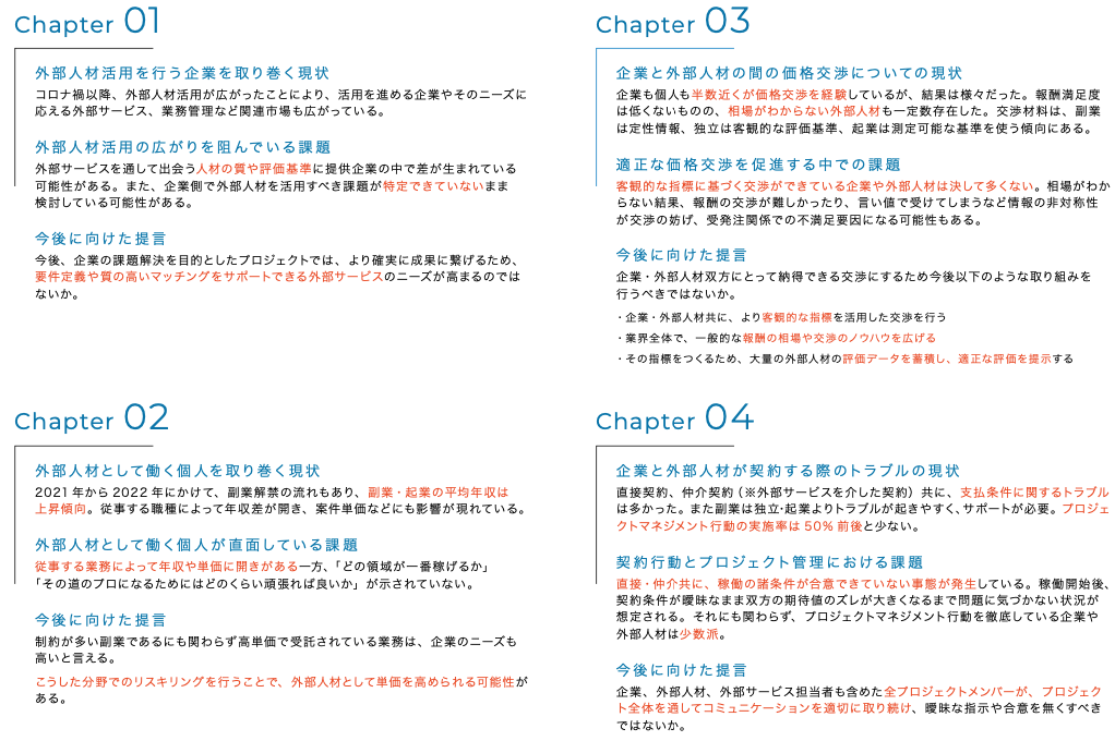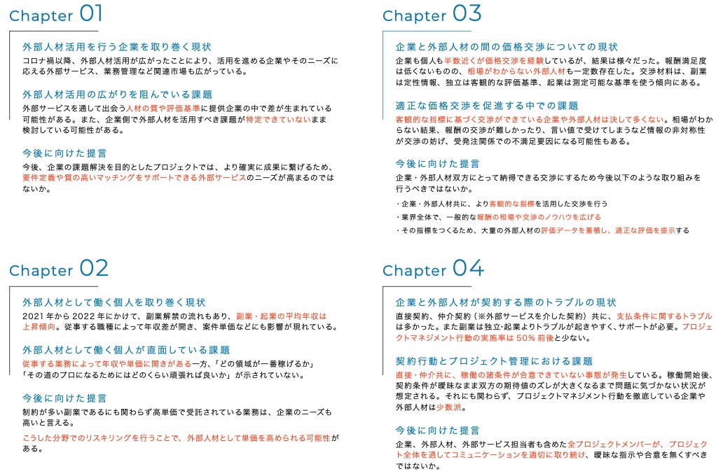 その他にCHAPTER4では、企業担当者と外部人材が経験した直接契約と外部サービス経由の仲介契約におけるトラブルとメリットについて調査しました。