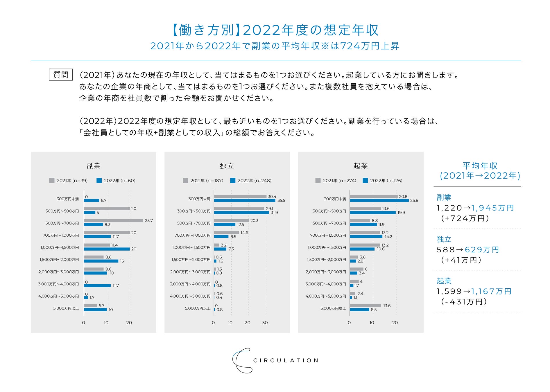 こうした変化を受けて、元々副業していた層の年収が高まったというより、高収入層の副業が増えたと考えられます。同様に、平均年収が増減した独立・起業層も、個人の能力や需要が変わったというよりは、キャリアの選択肢が広がった結果、市場に現れる層が変わった可能性があります。