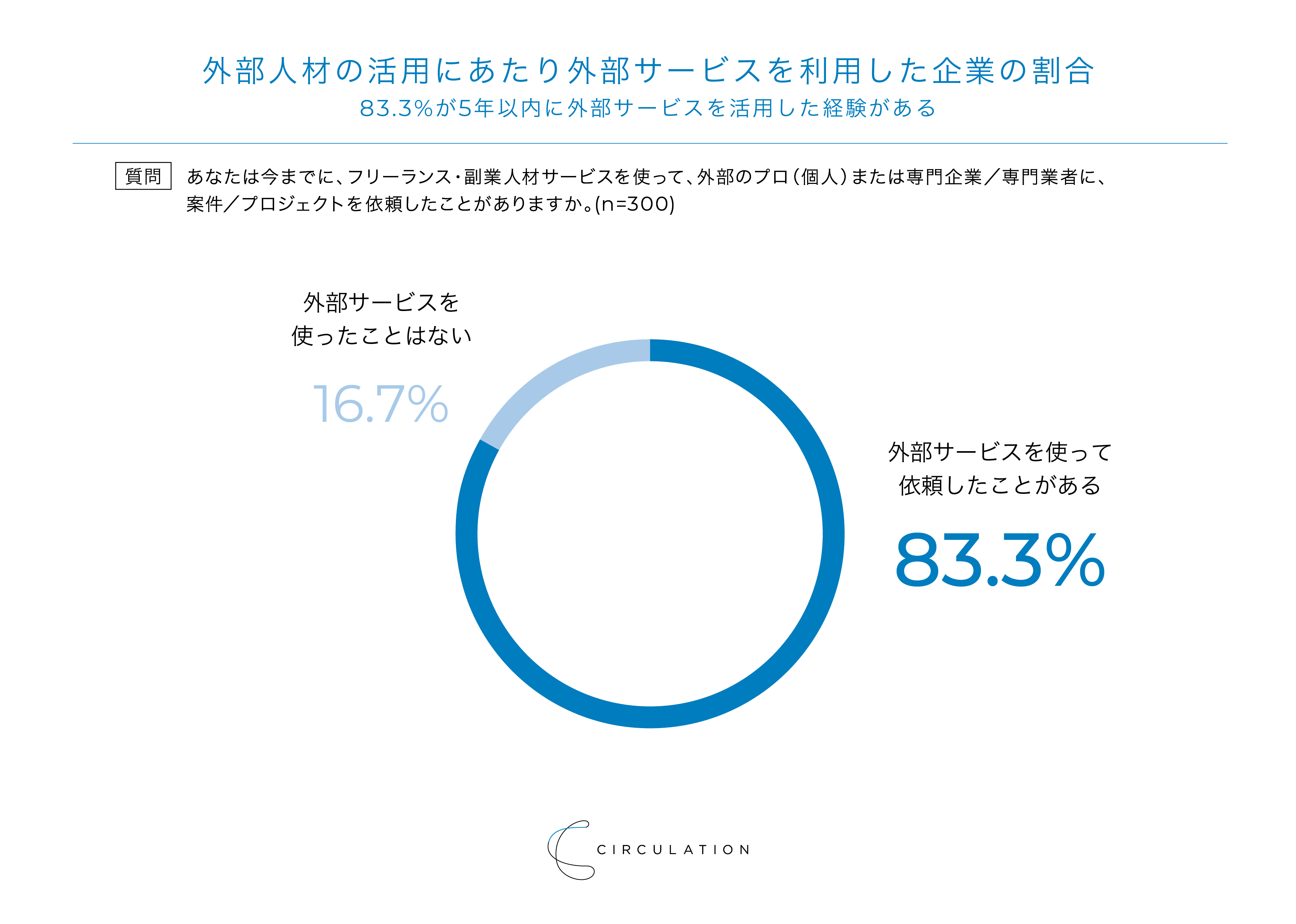 20,000名以上のプロの経験・知見を複数の企業でシェアし、経営課題を解決するプロシェアリング事業を運営する株式会社サーキュレーション(所在地:東京都渋谷区、代表取締役社長:久保田 雅俊、以下サーキュレーション)は、「プロシェアリング白書2023」を発刊しました。今回の調査では、外部人材を活用する企業の83.3%が仲介業者などの外部サービスを利用していることや、本調査が過去3年間主な対象としてきた業務を受託する外部人材のうち、副業層の平均年収が1.6倍と大きく伸びたこと、また外部人材との価格交渉や契約トラブルの実態についても明らかになりました。