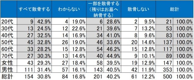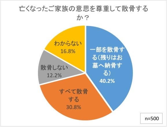 「一部を散骨する(残りはお墓へ納骨する)」という回答が一番多く40.2%、「すべて散骨する」が続き30.8%。
