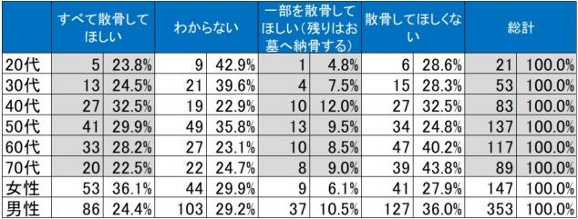 一方、あなた自身が亡くなったあと、散骨してほしいと思いますか?という質問では、「散骨してほしくない」が一番多く33.6%、続いて「わからない」29.4%、「すべて散骨して欲しい」27.8%という結果となった。