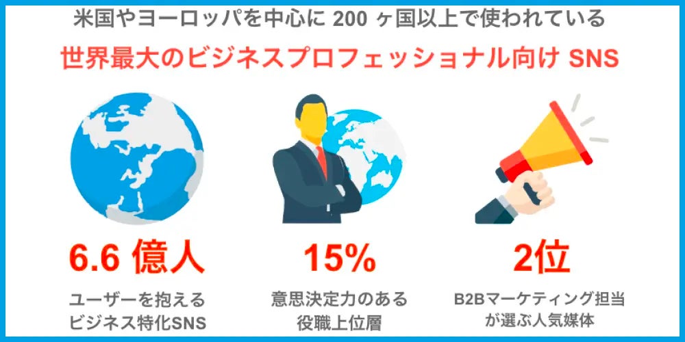 LinkedIn (リンクトイン) は 2003 年 5 月にサービスを開始した、シリコンバレー発の世界最大級のビジネス特化型SNSで、現在登録者数は全世界で 6.6 億人以上となっています。