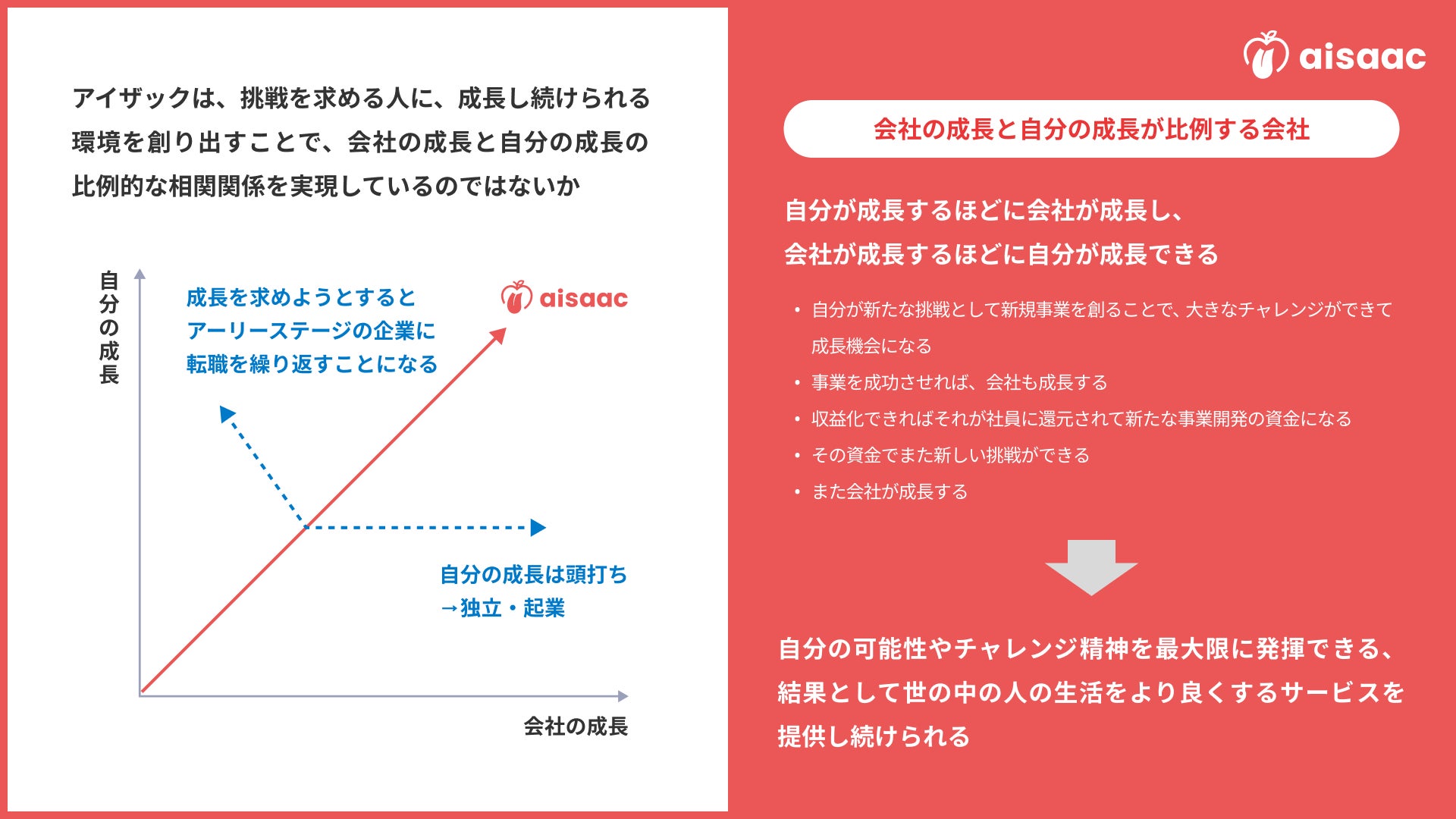 アイザックでは、100%自己資本を基盤とした独自の経営モデルを採用しています。これにより、投資家や株主からの評価に左右されずに、事業で創出した利益を新規事業へ展開、投資、そして社員への還元に活用することができます。また一般的な企業は、規模が拡大するにつれ外部からのプレッシャーもありリスクを避ける傾向にあるのに対し、アイザックではそのような思考パターンから解放されています。私たち独自のループ型経営は、安定してリスクを取り続けることを可能にし、持続可能な成長とイノベーションを実現できると自負しています。