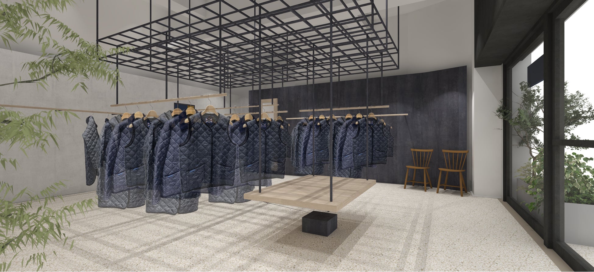 センターの階段で左右2つに分かれたユニークなショップは、レトロモダンなビルの面影を残しつつ、ラベンハムのトラディショナルな佇まいとモダンなムードをミックスしてアップデート。ブランドの生まれ故郷、ラベンハム村で保存されている17世紀からの建物、通称THE CROOKED HOUSE(クルックハウス)をイメージした左官仕上げの白壁と、インダストリアルなファクトリーを酸化被膜の自然な濃淡で表現した黒皮鉄板壁のコントラスト、「Using Up(無駄なく使い切る)」をキーワードに古材を再利用した什器など、ブランドが掲げるポリシー「Being Better(少しずつより良い方向に変えていく)」が落とし込まれています。